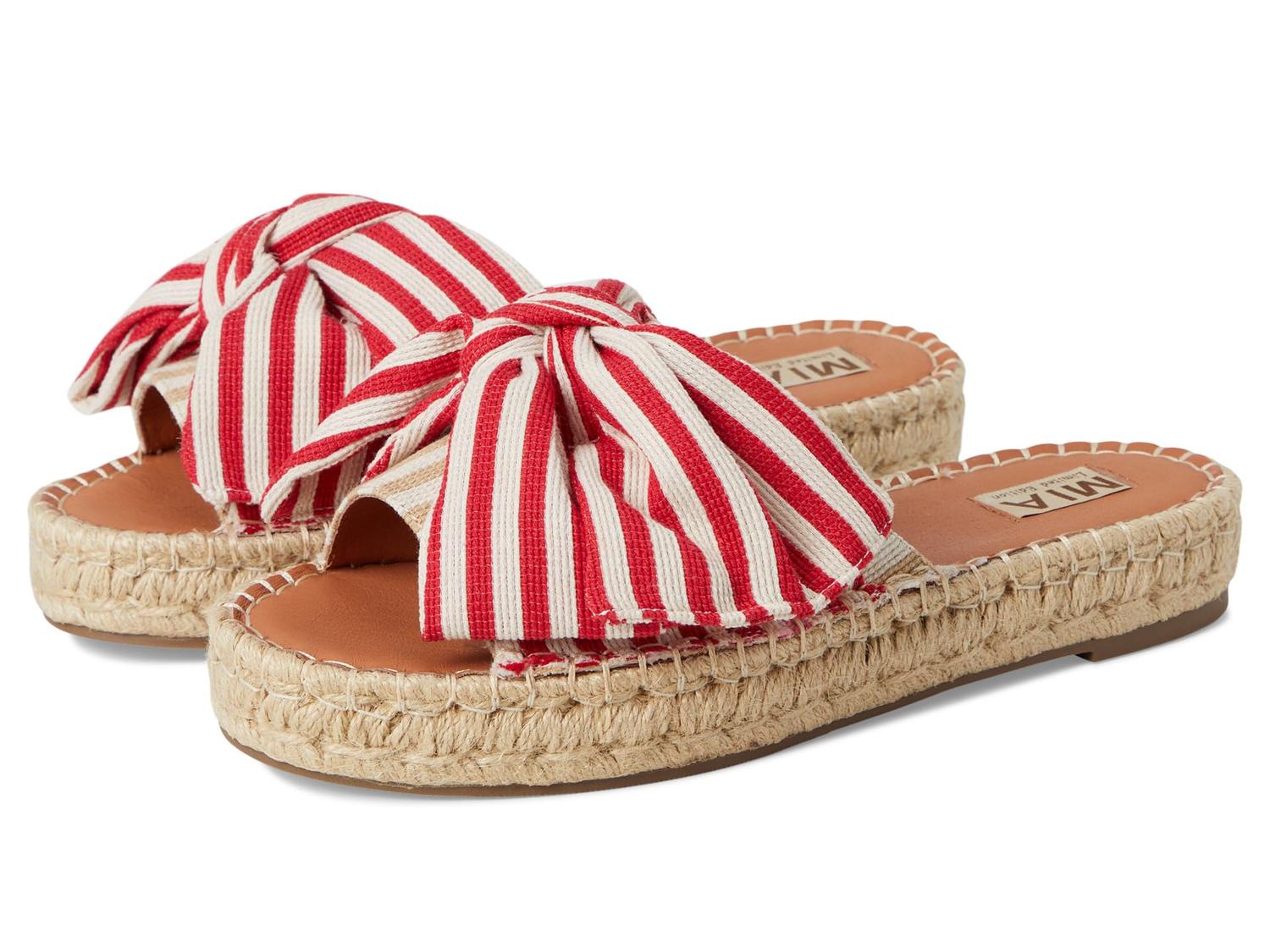 • Сандалии MIA MLE-Danielle созданы для любителей бантов. Они украшены полосатым тканевым бантом и роскошной кожаной стелькой, что делает их идеальным вариантом для теплой погоды. Каблук-платформа, обтянутый эспадрильей, обеспечивает оптимальный подъем.