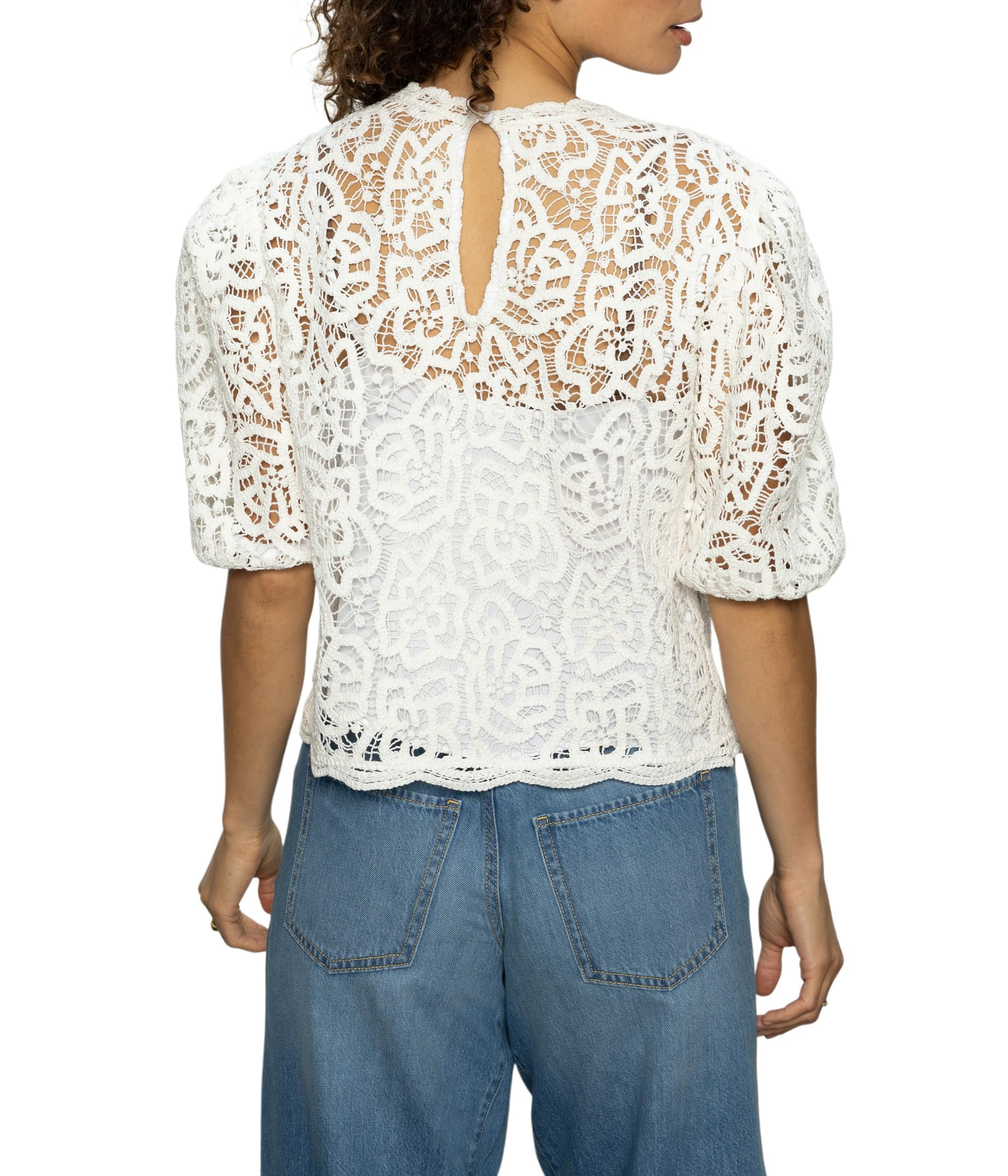 • Будьте центром притяжения в стильной кружевной футболке Cherished Sanctuary . Топ с круглым вырезом, короткими рукавами, кружевной отделкой по всей поверхности, классической посадкой, замочной скважиной сзади с застежкой на пуговицы, приталенным фасоном и прямым низом.