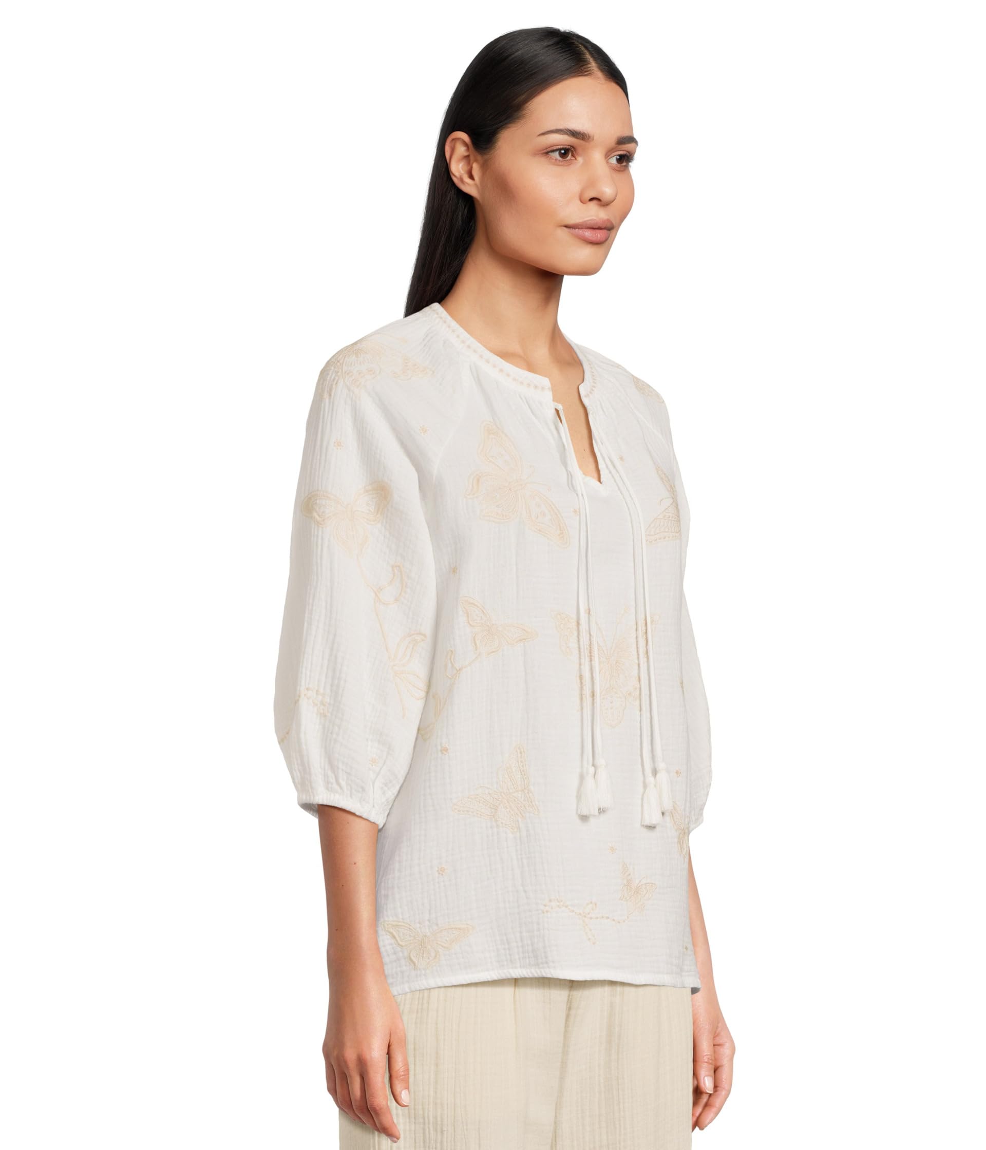 • Воздушная и легкая блузка Johnny Was Koleen свободного покроя с тонким V-образным вырезом и изящными завязками создает непринужденный богемный образ. Рукава-баллоны длиной три четверти придают мягкость и объем, а вышивка бабочками в тон ткани подчеркивает текстуру и женственность. Идеально подходит для теплых дней или прохладных вечеров, прекрасно сочетается с чем угодно - от струящихся юбок до джинсовой ткани.