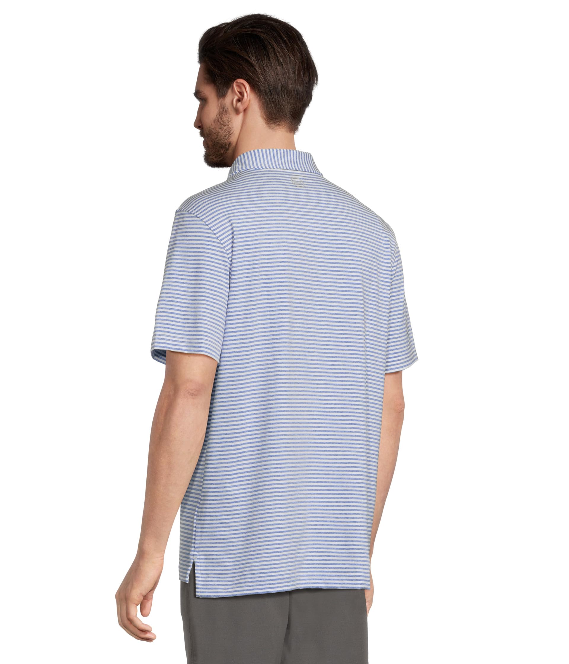 • В этом спортивном поло с вересковыми полосками по всей поверхности можно стильно перенестись с поля для гольфа в клуб и обратно в офис.