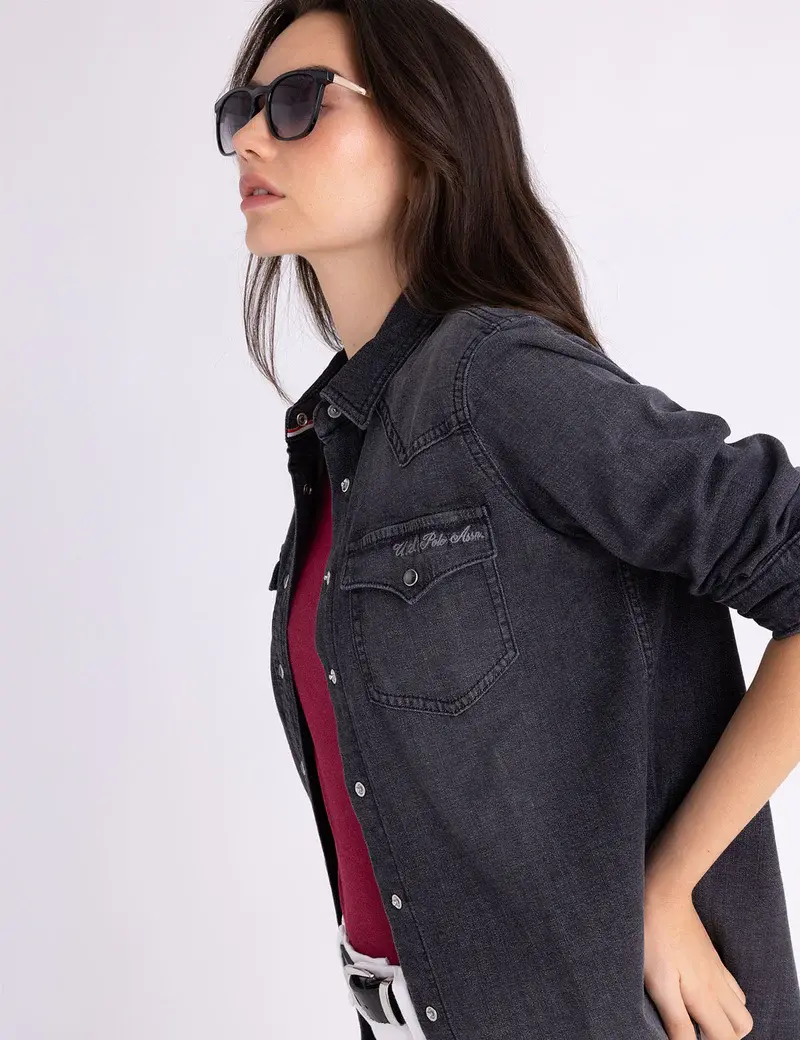 Воплотите в жизнь неподвластный времени стиль вестерн с помощью джинсовой рубашки с длинным рукавом — универсального элемента гардероба, созданного для создания непринужденного и элегантного образа. Эта рубашка с классическими перламутровыми пуговицами, заостренными кокетками и двумя нагрудными карманами привнесет аутентичный американский шарм в ваш повседневный образ. Мягкий чёрный деним позволяет легко создавать разные образы — наденьте её поверх футболки, заправьте в джинсы или просто накиньте на блузку для создания непринуждённого образа.