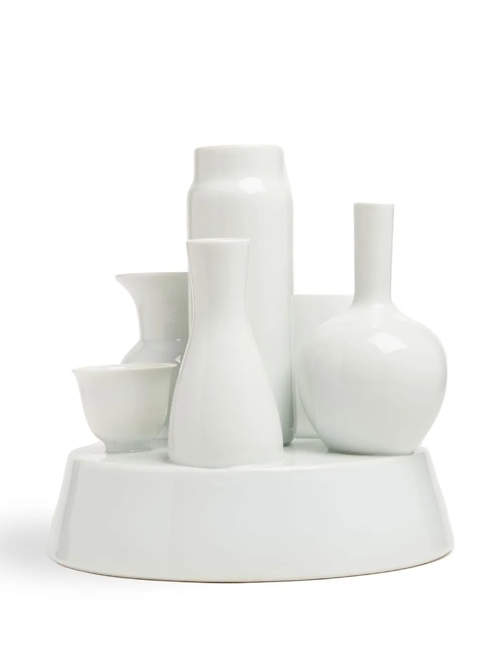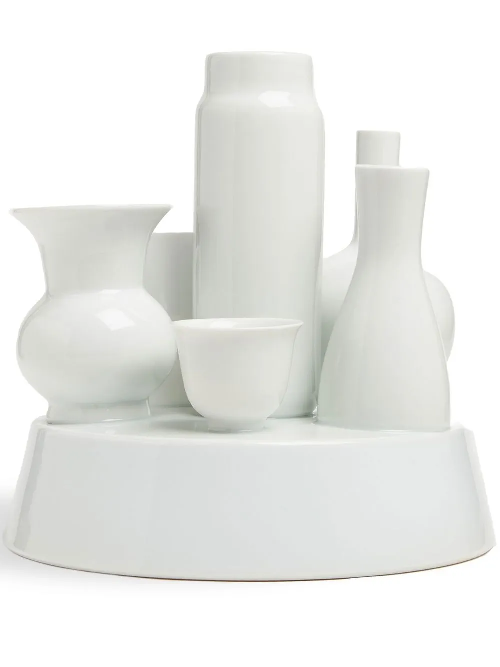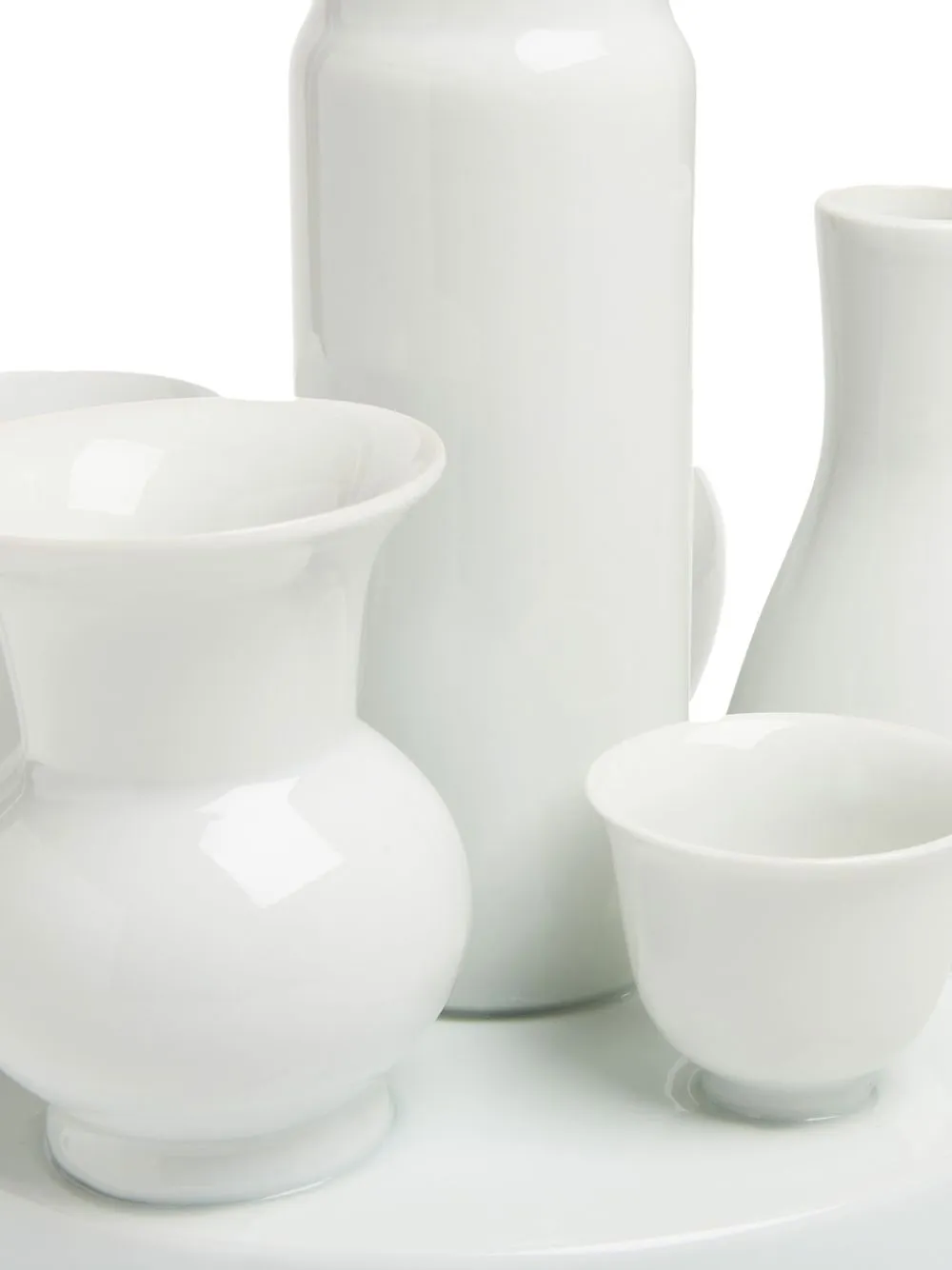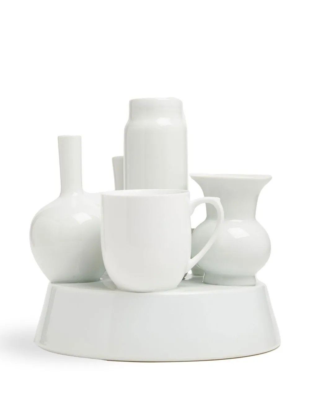 Белый, фарфор, принт с логотипом сзади и скульптурная ручка.