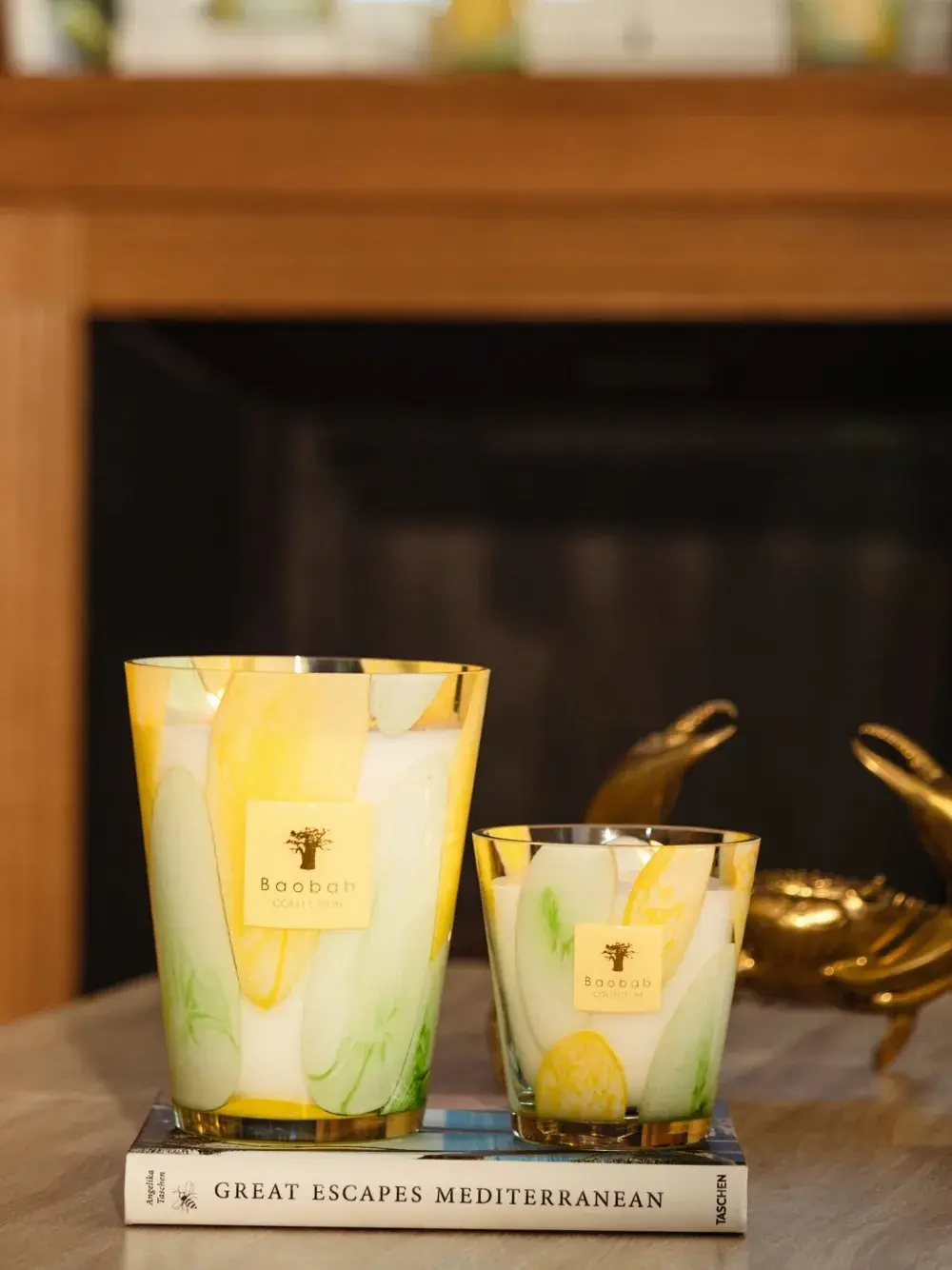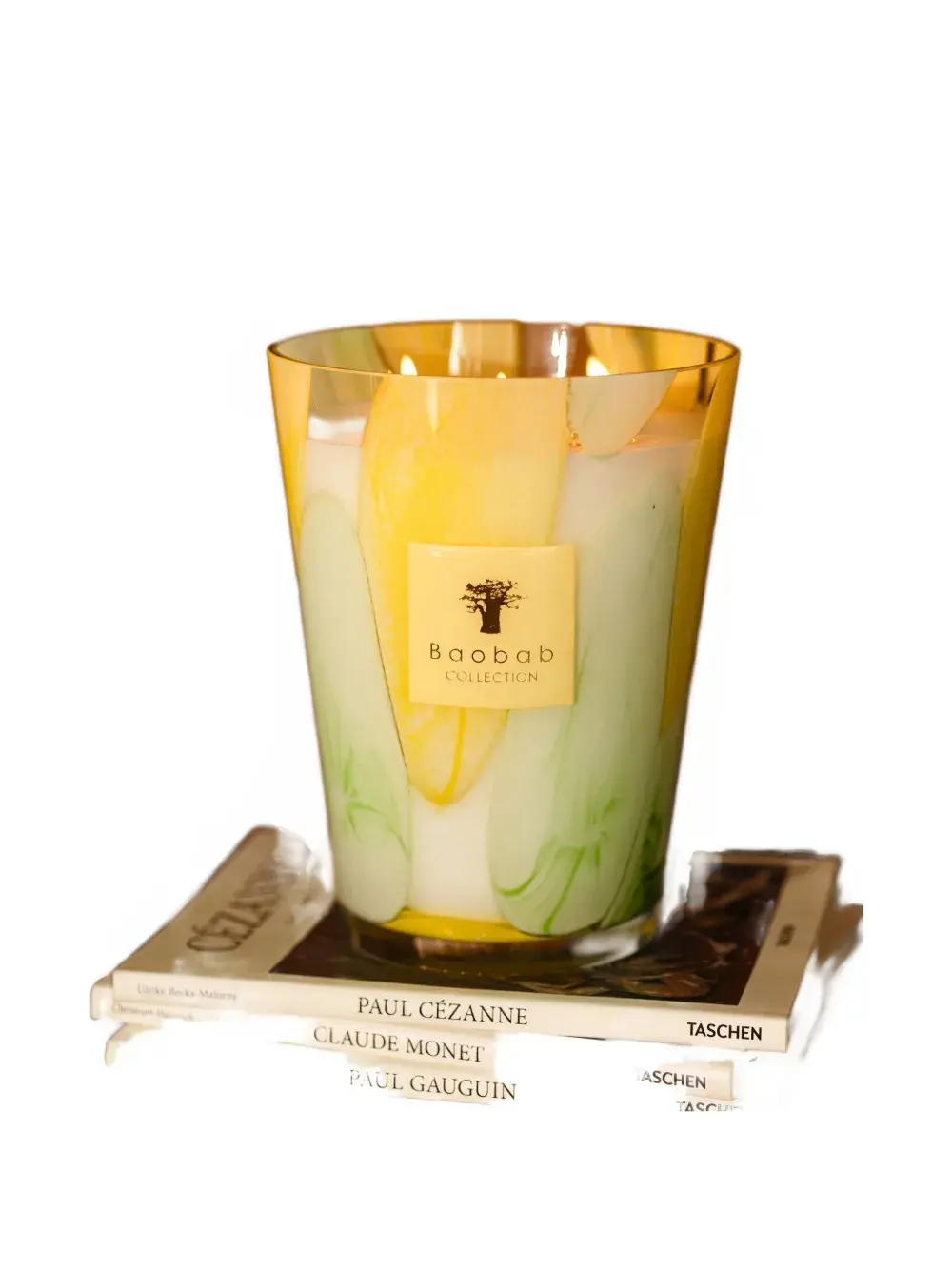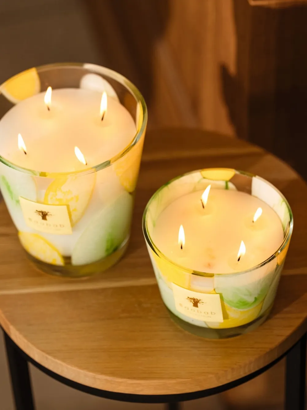 жёлто-зелёная свеча с мраморным эффектом в стеклянном контейнере, несколько фитилей, ароматизированная. Пожалуйста, ознакомьтесь с вкладкой «Размер и посадка», чтобы узнать больше о размерах этого товара.