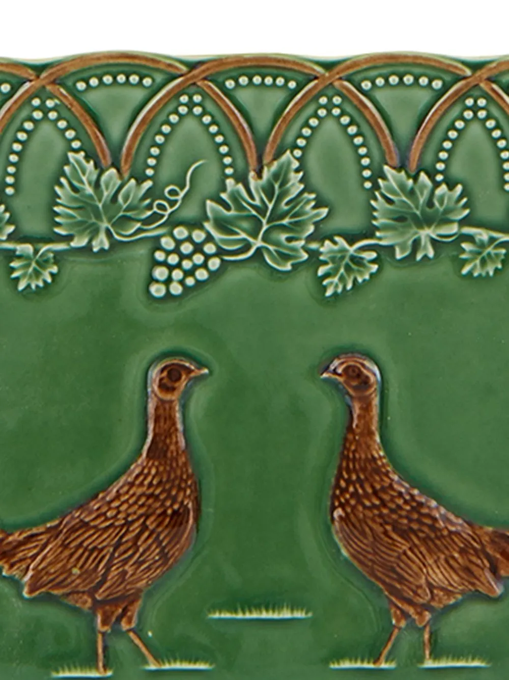 Темно-зеленый, коричневый, глазурованное покрытие, анималистичный принт и прямоугольная форма.