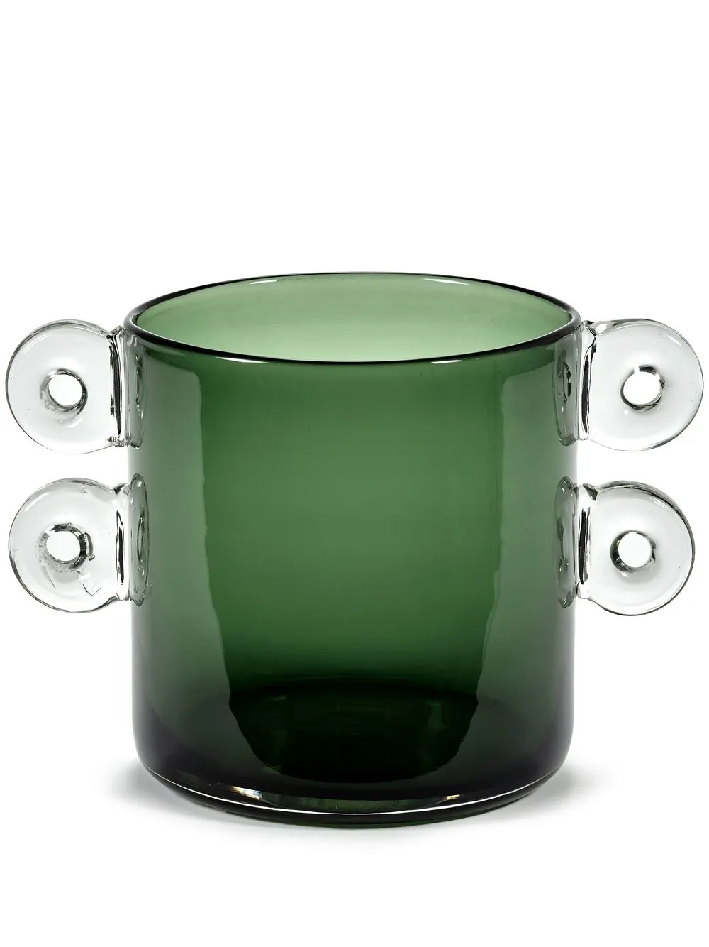 Темно-зеленый, стекло, прозрачный материал, цилиндрическая форма и две закругленные ручки по бокам.