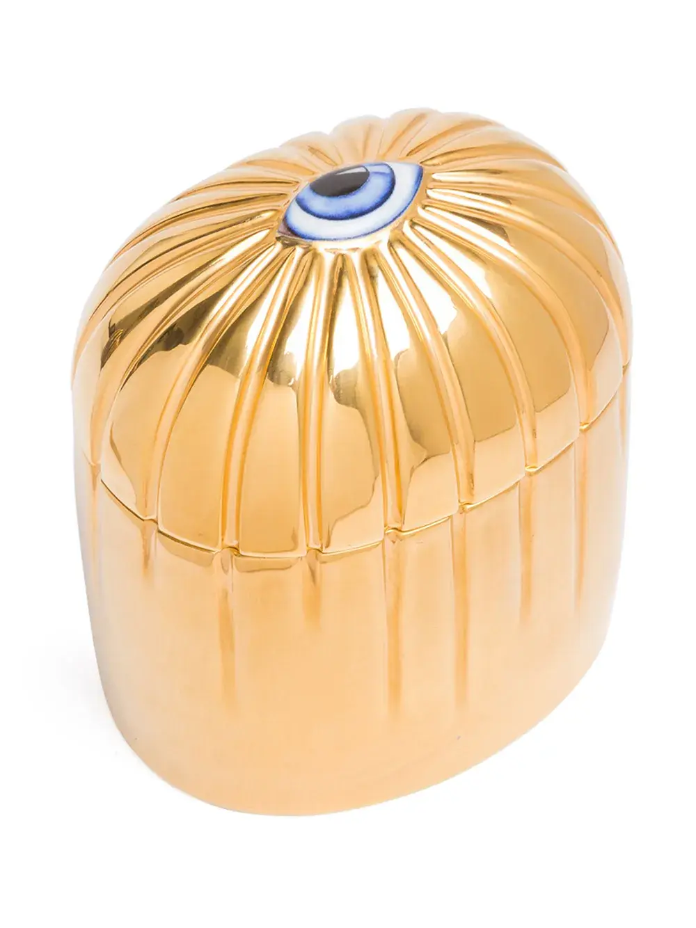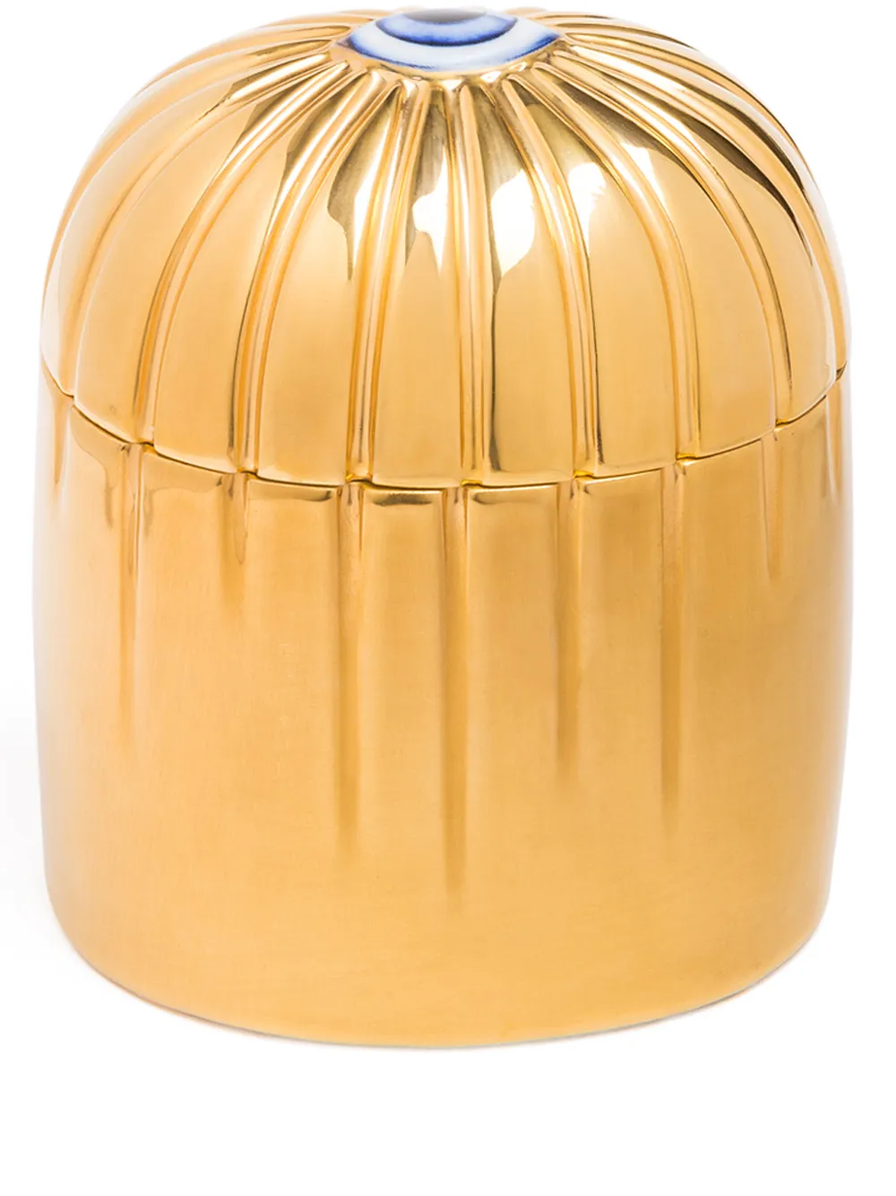 Свеча Lito Or от L’Objet в фактурном фарфоровом подсвечнике с позолотой из 24-каратного золота, дополненном крышкой с декором в виде глаза. Аромат включает ноты ветивера.