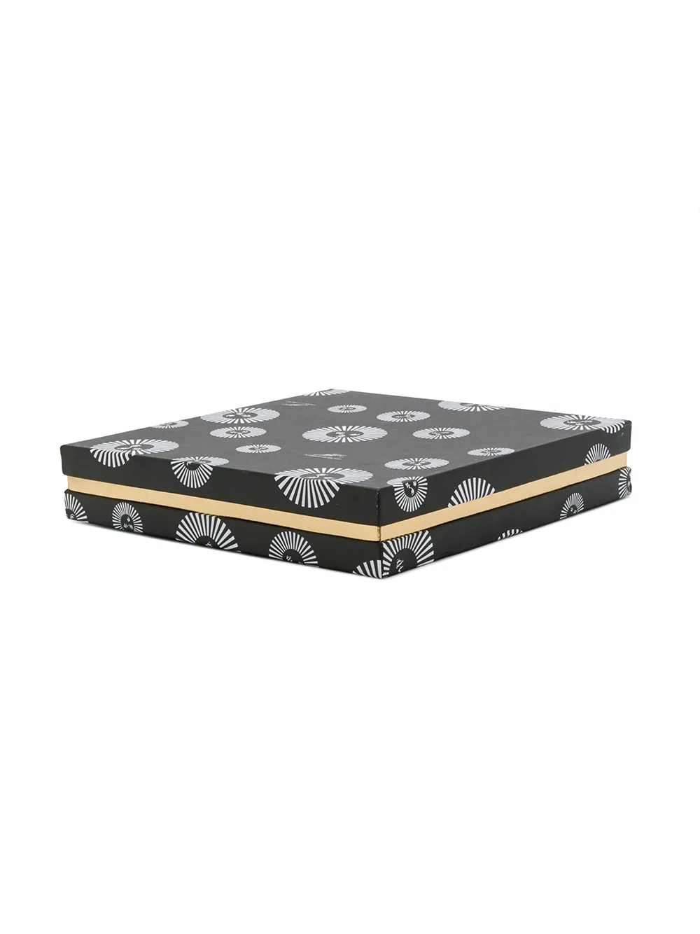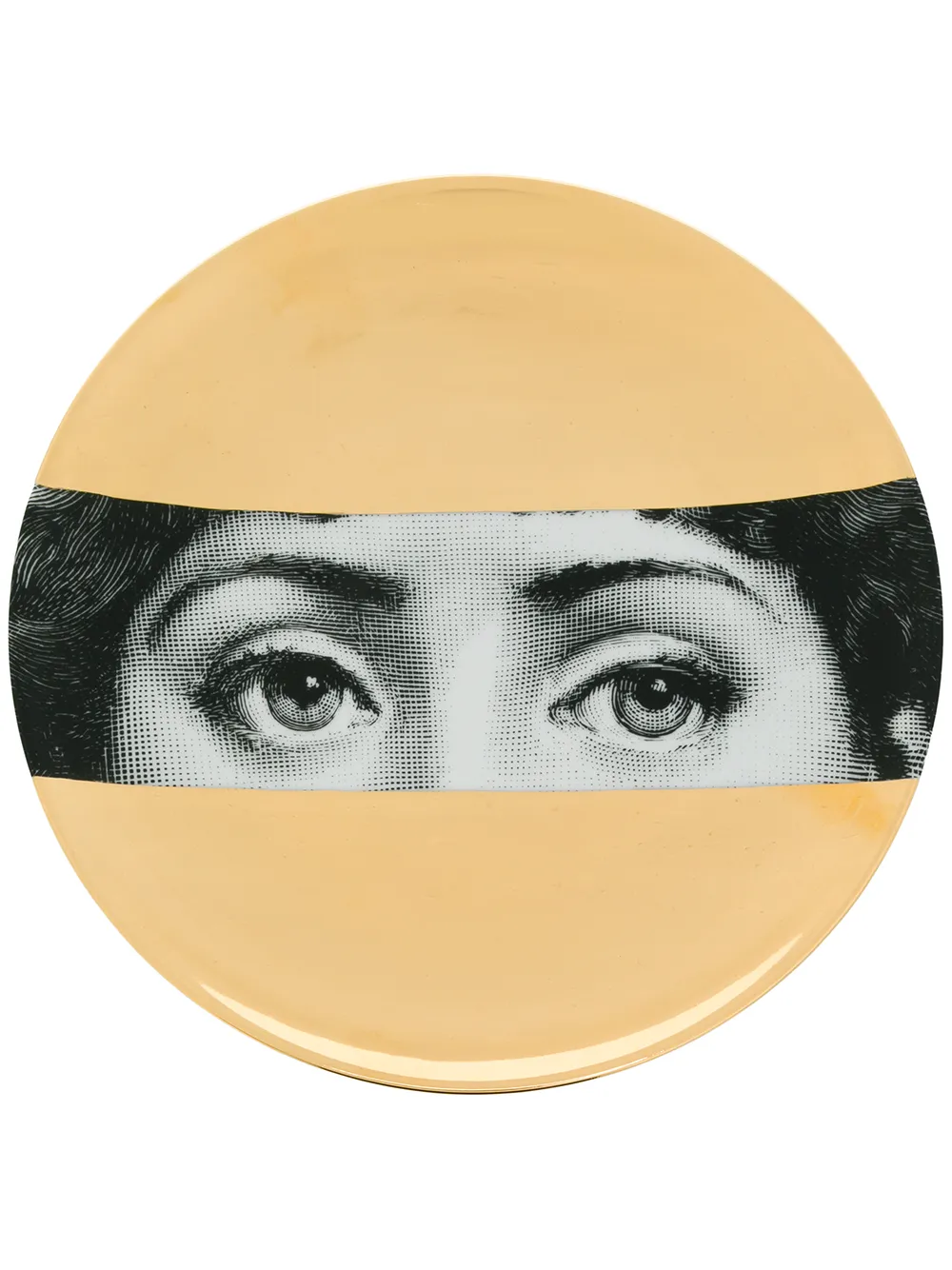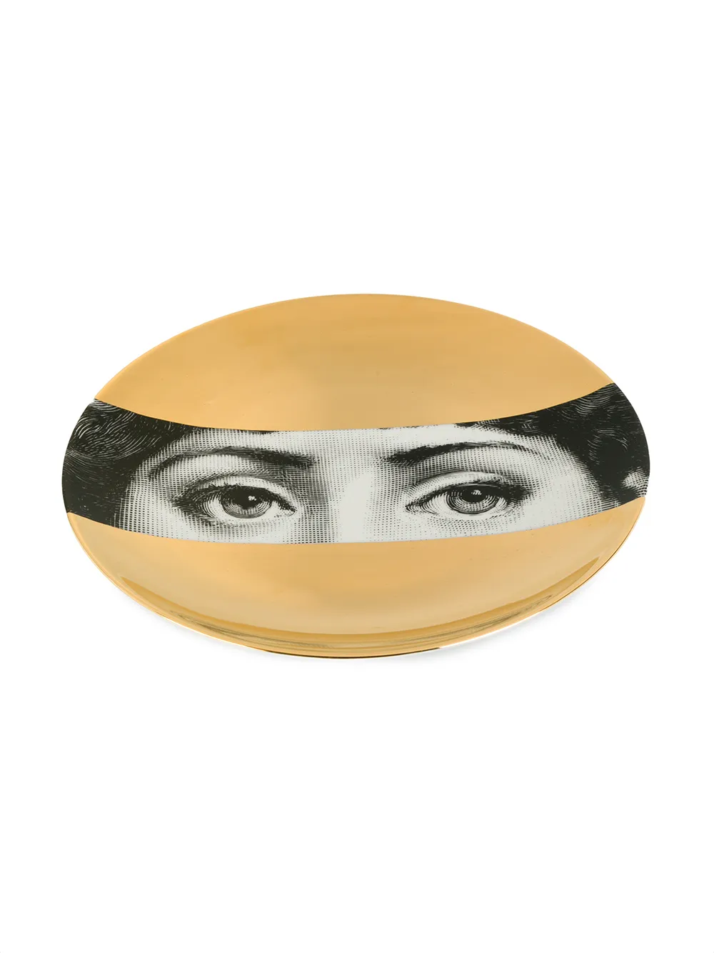 Золотистая с черным и белым керамическая тарелка с принтом от Fornasetti Profumi.Модель в стиле унисекс.