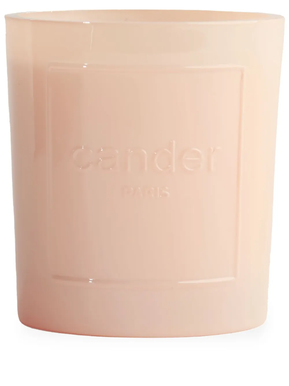 Светло-розовый, воск, стекло, глазурованное покрытие, тисненый логотип спереди, фитиль из хлопка и 60 часов горения.