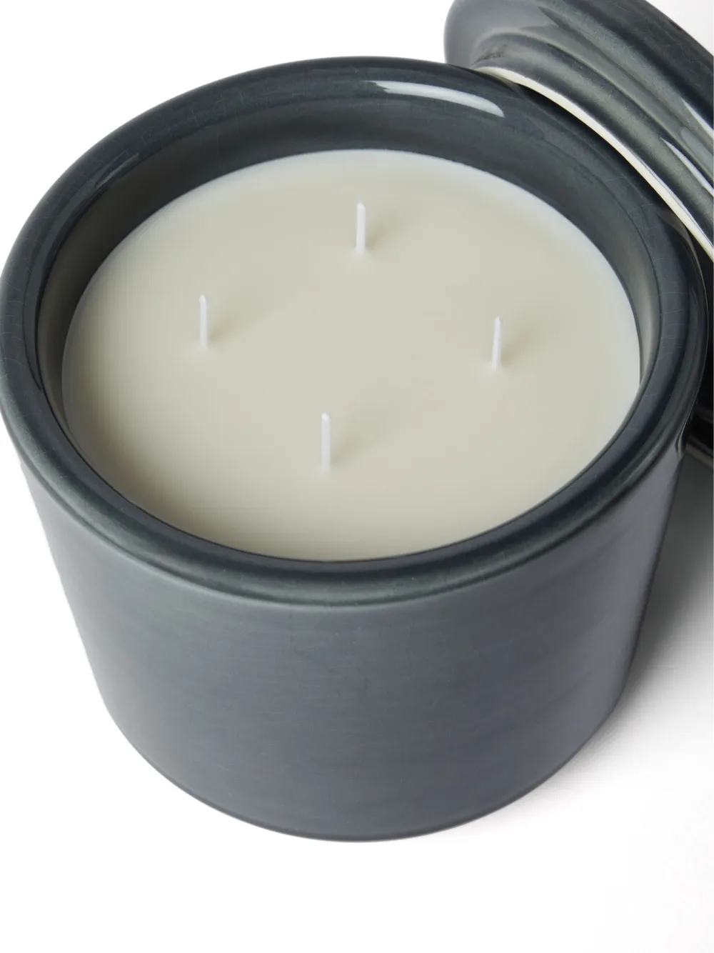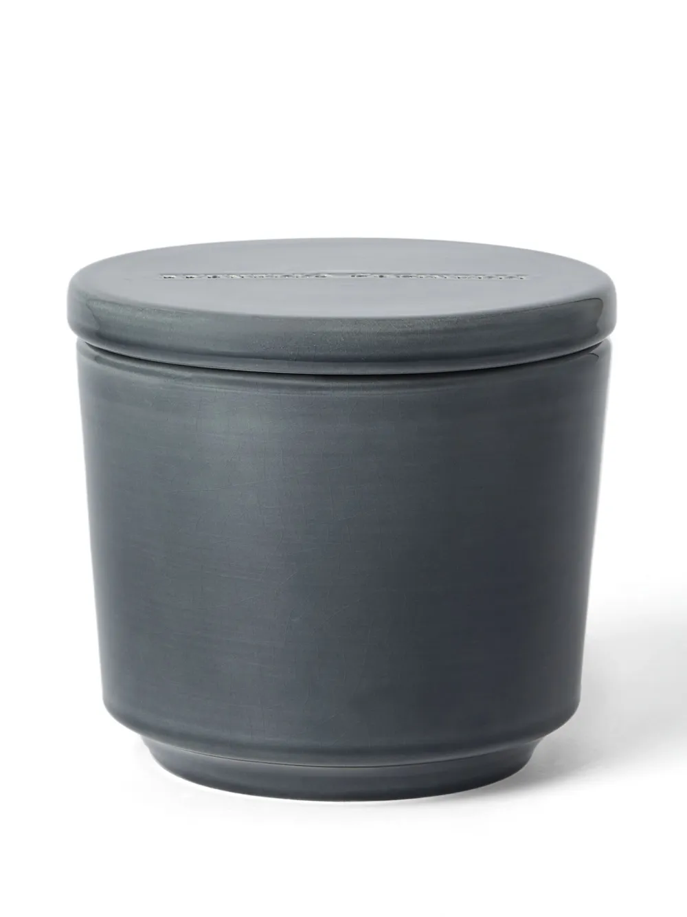 Антрацитово-серый, керамика, парафин, цилиндрический дизайн, тисненый логотип спереди, эффект кракле, три фитиля из хлопка и крышка.
