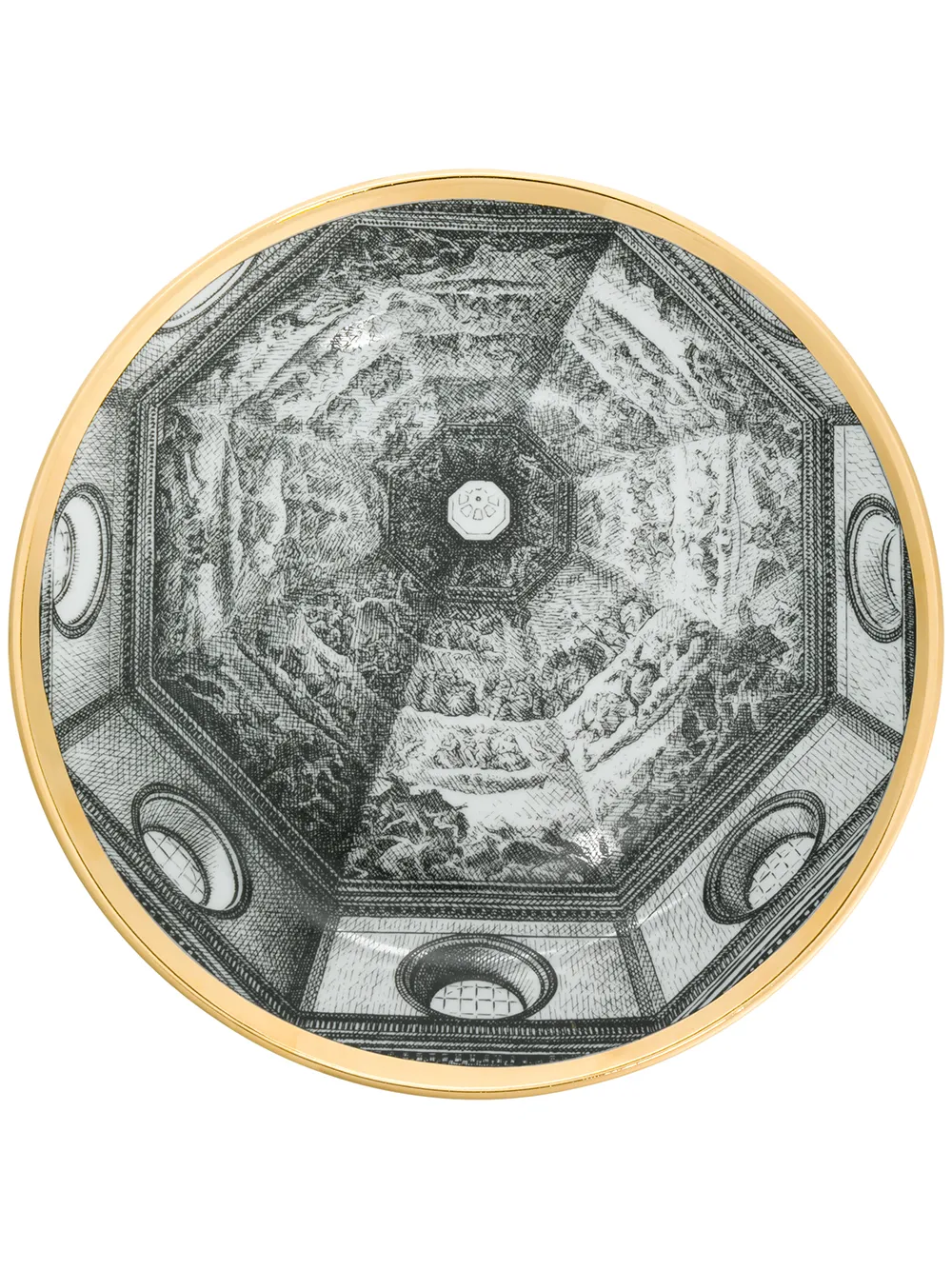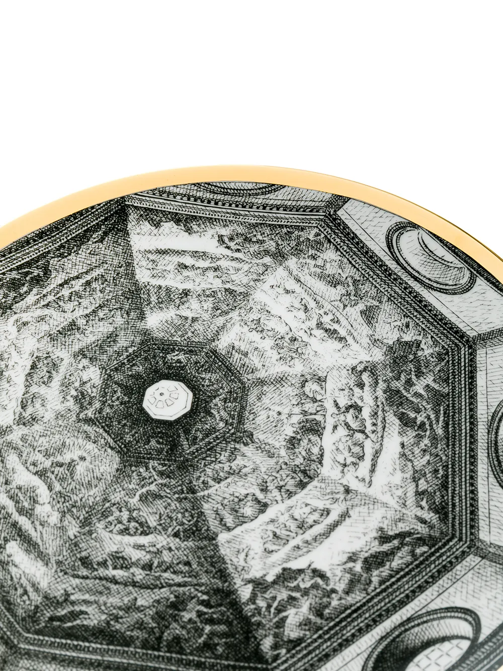 Черная с белым и золотистым керамическая тарелка с принтом от Fornasetti.