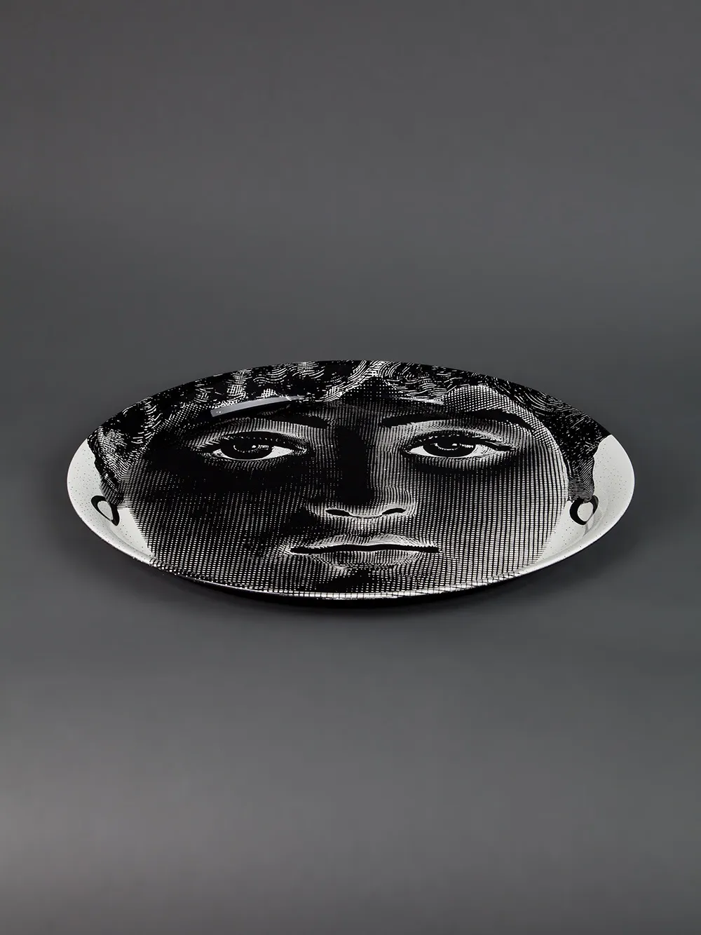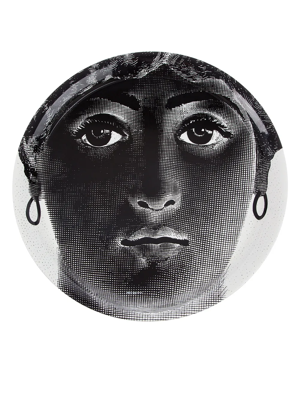 Чёрно-белый металлический поднос с принтом от Fornasetti.