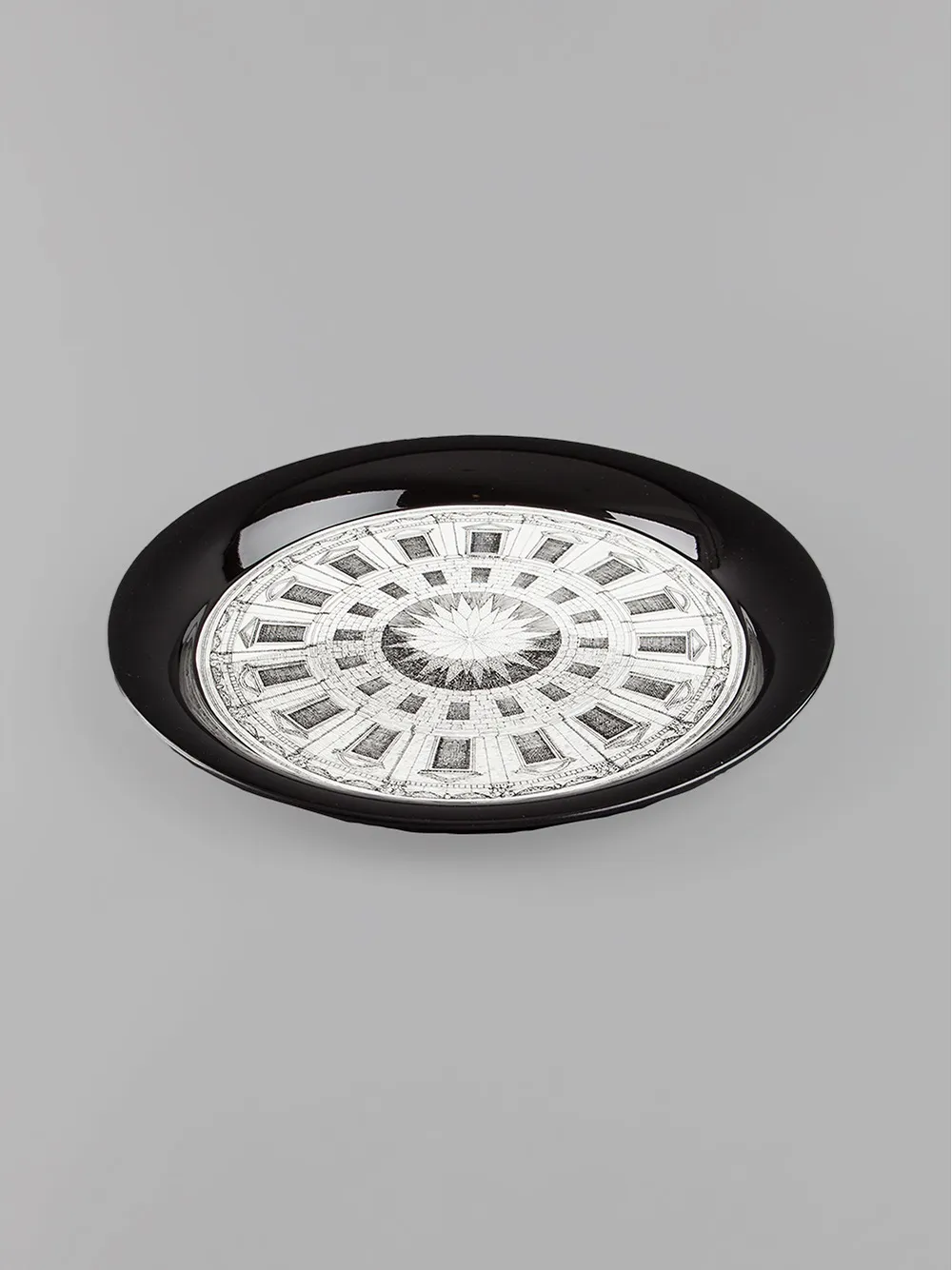 Чёрно-белый керамический круглый поднос с рисунком от Fornasetti.