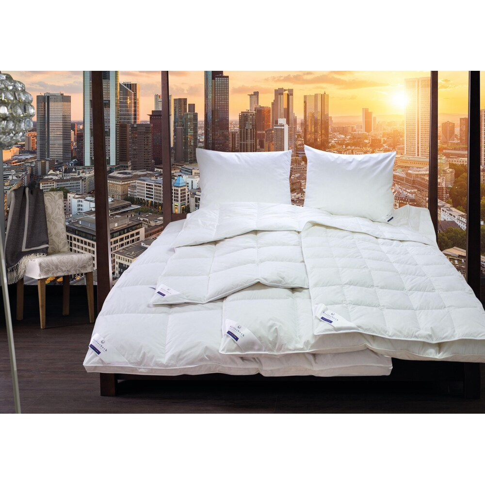 Новый белый гусиный пух и перья прекрасно гармонируют с тонким хлопковым наполнителем. Приятный мягкий пух обеспечивает безопасность. Очень хорошо регулируемое поглощение и выделение влаги обеспечивает сбалансированную среду для сна.
