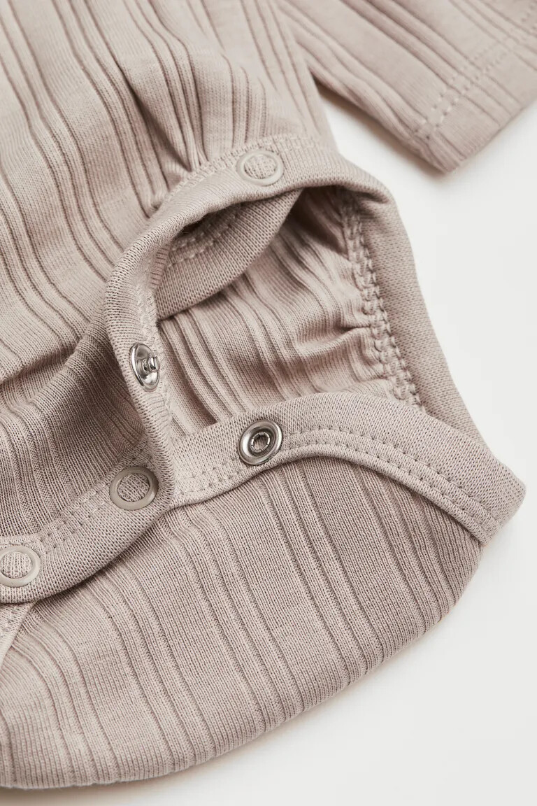 Боди из мягкого хлопкового трикотажа в рубчик. Кнопки по бокам и внизу. Собранные швы вокруг бедер обеспечивают комфорт и плотное прилегание подгузника.