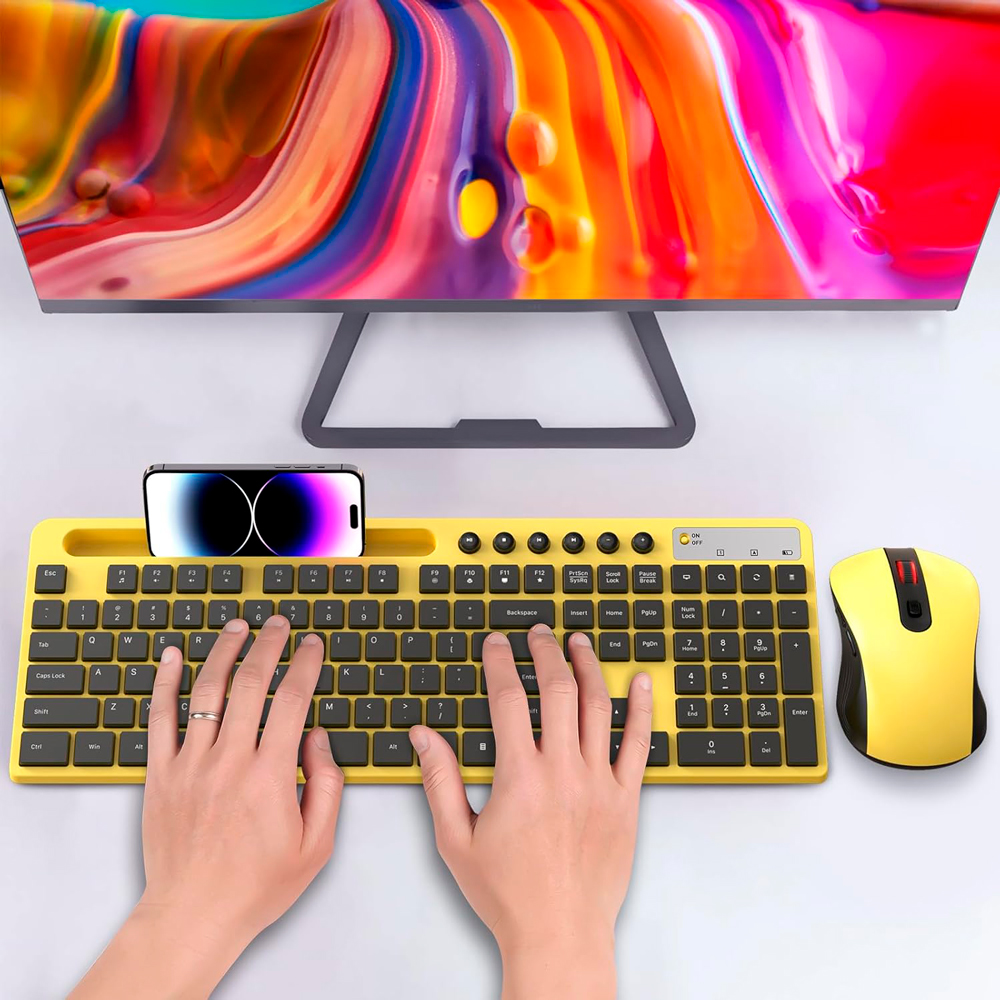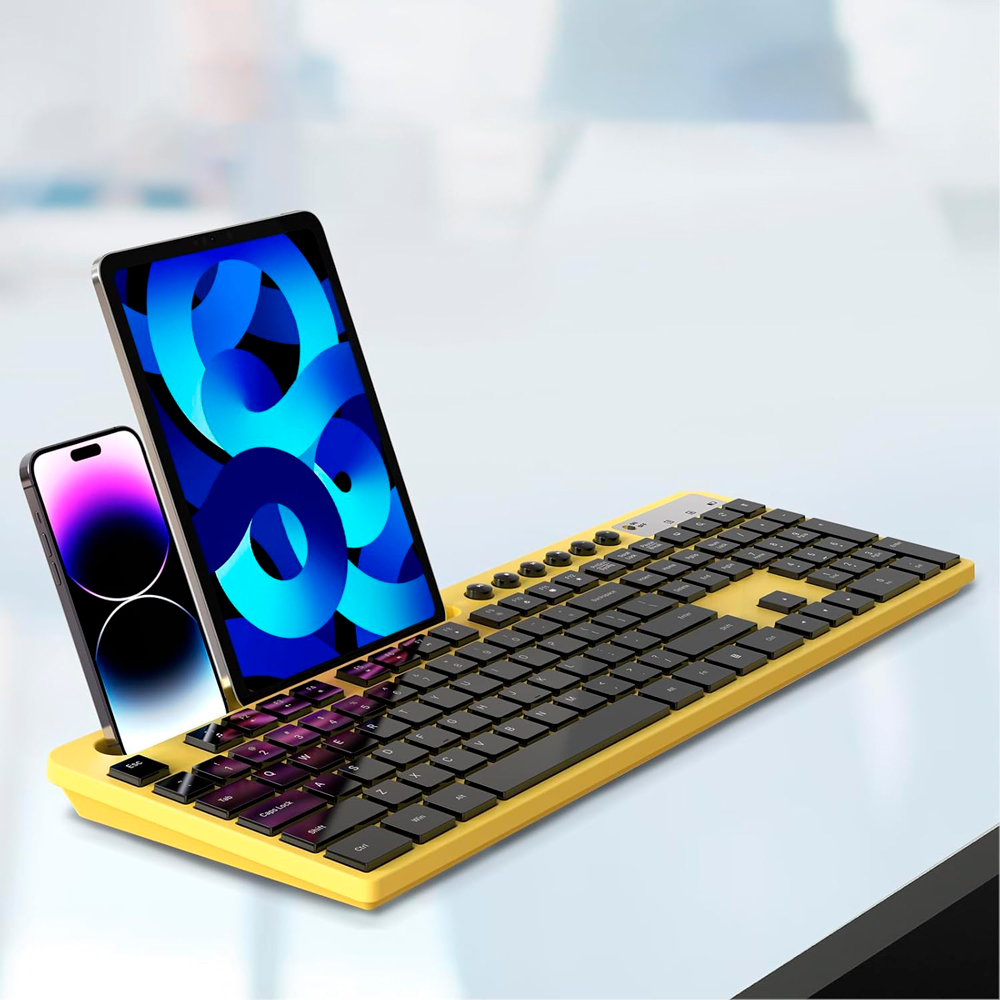 Эргономичная беспроводная компьютерная клавиатура 2,4 ГГц с держателем для планшета или телефона с диагональю 9,84 дюйма. 6 независимых мультимедийных кнопок и 12 мультимедийных горячих клавиш в сочетании с FN повышают эффективность работы.
