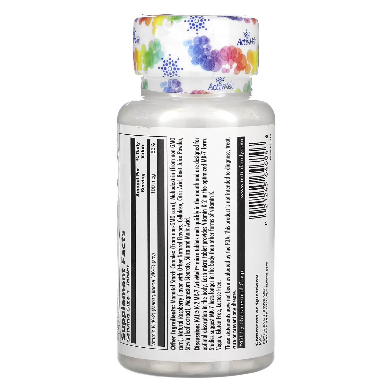 Комментарий. Микротаблетки KAL® K-2 MK-7 ActivMelt™ быстро тают во рту и оптимально усваиваются в организме. Каждая микротаблетка содержит витамин К-2 в оптимизированной форме МК-7. Исследования показывают, что MK-7 сохраняется в организме дольше, чем другие формы витамина К.