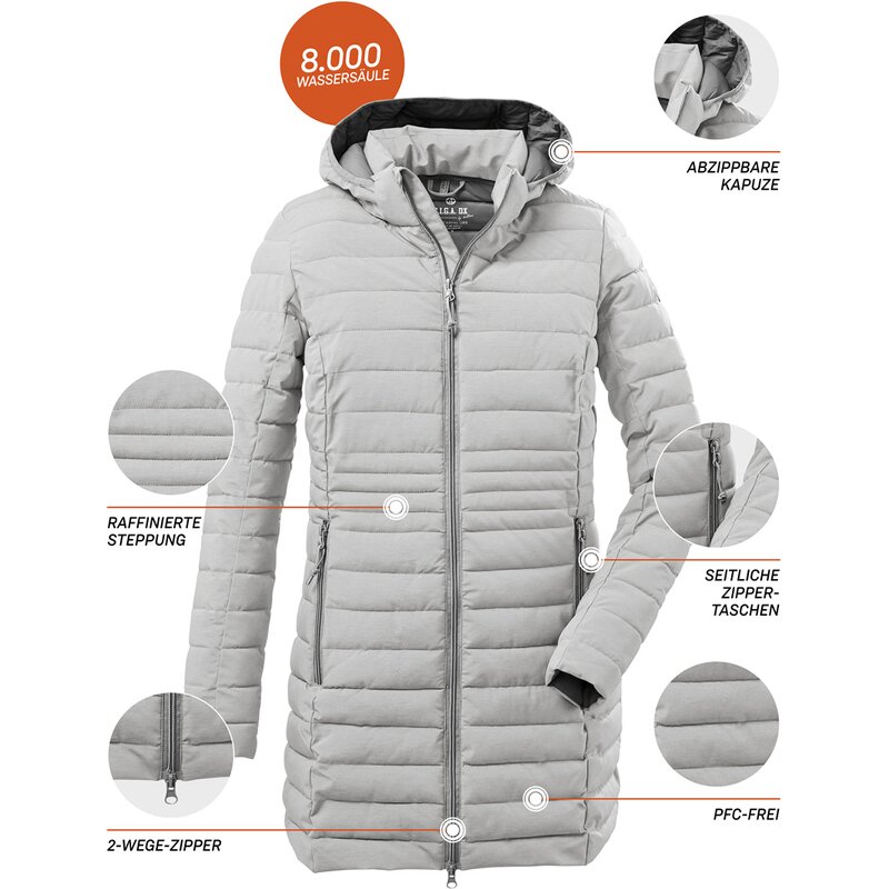Женская функциональная парка с эффектом пуха от GIGA DX впечатляет облегающим кроем и подчеркивающей фигуру стёжкой. Стёганая парка водоотталкивающая и ветронепроницаемая (гидростатическое давление 8000 мм), а также дышащая. Отстёгивающийся капюшон на молнии и высокий воротник-стойка обеспечивают дополнительную защиту от ветра и дождя. Два боковых кармана застёгиваются на молнии. Двусторонняя молния расстёгивается сверху и снизу, обеспечивая свободу движений. Парка также оснащена практичной защитой подбородка. Для killtec особенно важно делать свои коллекции более экологичными и актуальными в будущем. Поэтому killtec уделяет всё больше внимания ответственным производственным процессам. Поэтому эта парка пропитана веществами, не содержащими фтора.