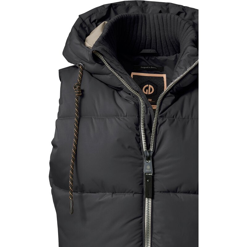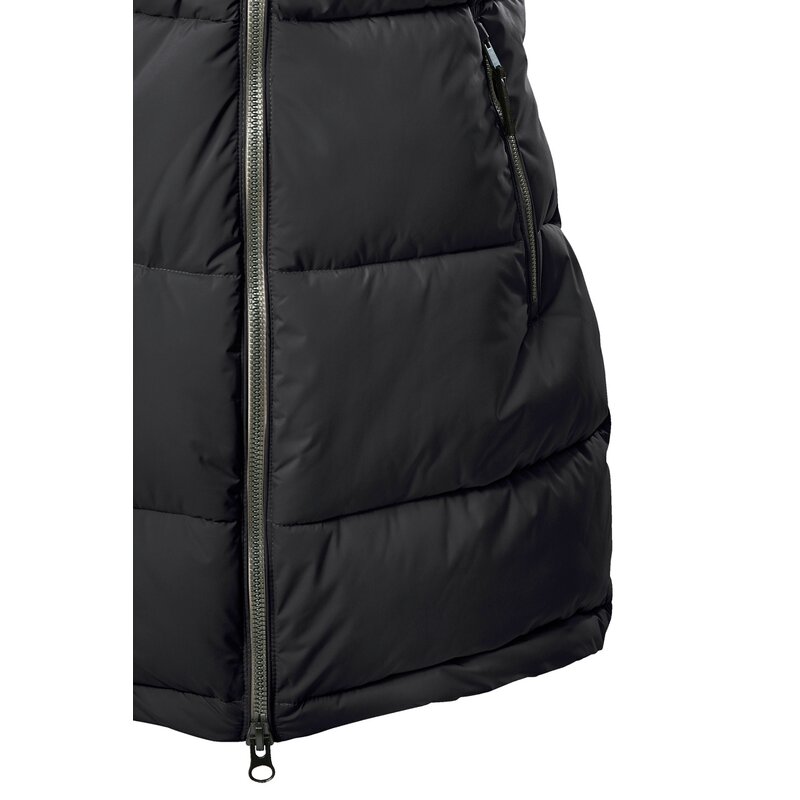 С удлиненным и функциональным жилетом GIGA DX с эффектом пуха вы будете в тренде. Этот стеганый жилет водоотталкивающий, ветронепроницаемый и дышащий. Капюшон и удобный трикотажный воротник обеспечивают дополнительную защиту от холода и ветра. Подол регулируется шнурком. Два кармана на молнии и внутренний карман позволяют хранить телефон, ключи и другие вещи. Двусторонняя молния оснащена практичной защитой подбородка, предотвращая натирание кожи. Компания killtec особенно стремится к тому, чтобы ее коллекции были более экологичными и соответствовали требованиям завтрашнего дня. Поэтому killtec уделяет все больше внимания более ответственным производственным процессам. Поэтому этот жилет пропитан веществами, не содержащими фтора, и частично изготовлен из переработанного материала.