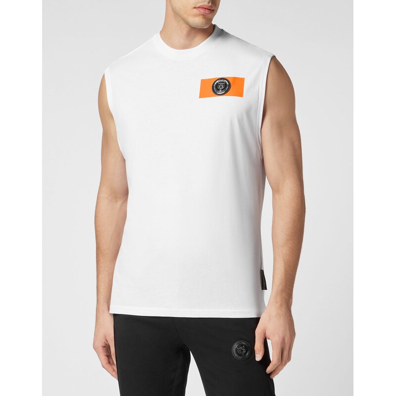 Plein Sport даёт вам возможность выделиться из толпы даже во время интенсивных тренировок. Обратите внимание на этот новый топ без рукавов с культовыми эмблемами бренда. Максимальный комфорт благодаря естественной эластичности хлопкового трикотажа. Прорезиненная нашивка с тигром, пришитая поверх контрастной окантовки из ленты на левой стороне груди. Ребристый вырез горловины. Двойная строчка по подолу.