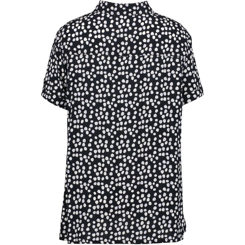 Блузка Luhta для женщин. Короткие рукава. Застежка на пуговицы спереди. Закатывающиеся рукава. Разрезы по низу. Печатный рисунок. Этикетка с логотипом. Содержит вискозные волокна LENZING ECOVERO, которые производятся из сертифицированных возобновляемых источников древесины в рамках экологически безопасного процесса производства.