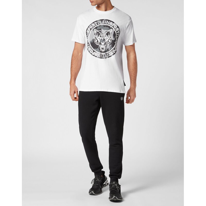 Plein Sport даёт вам возможность выделиться из толпы даже во время интенсивных тренировок. Обратите внимание на эту новую футболку с культовым тигром. Максимальный комфорт благодаря естественной эластичности хлопкового трикотажа. Культовый принт с тигром на камуфляжном фоне спереди. Ребристый вырез горловины. Двойная строчка по подолу.