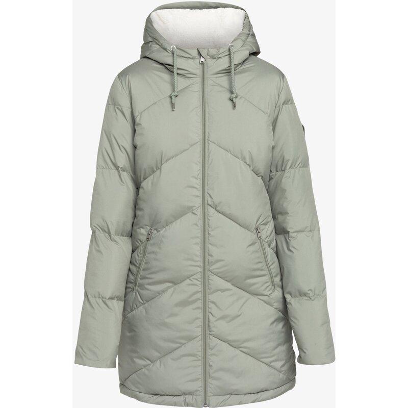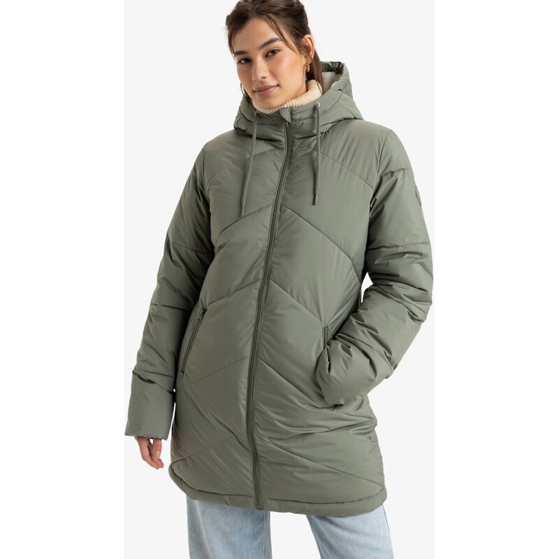 Женская стеганая куртка с капюшоном. Характеристики: Коллекция: Value Line, Материал: полиэстер [79 г/м²], Крой: удлинённый, Утеплитель: плотный, Капюшон: полностью на подкладке и с подкладкой, Подкладка: полностью на подкладке и с подкладкой, Карманы: боковые прорезные карманы на кнопках, Застёжка: молния спереди по всей длине, Логотип: силиконовая нашивка Roxy, Другие особенности: боковые разрезы на кнопках, эластичный капюшон на шнурке, водоотталкивающая пропитка.