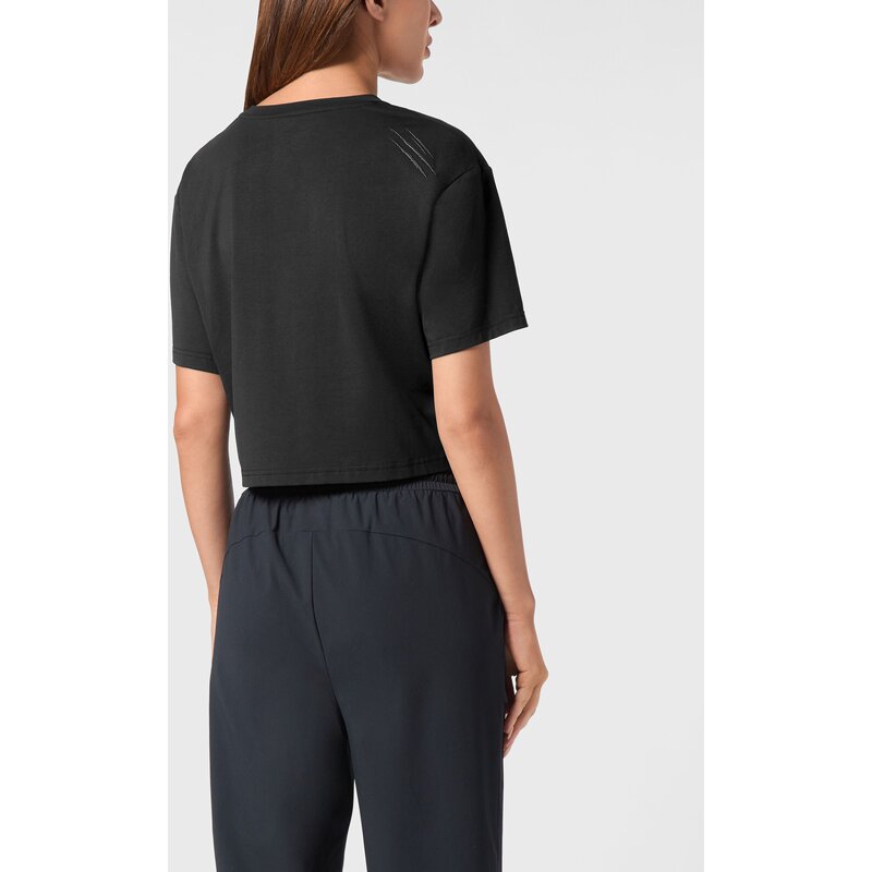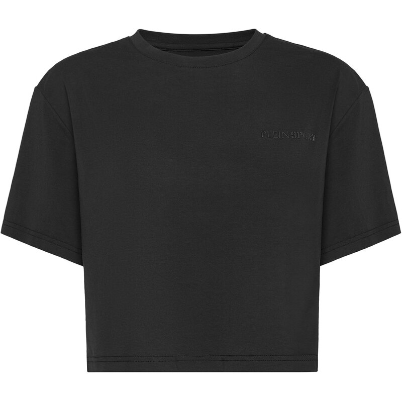 Plein Sport дает вам возможность выделиться даже во время интенсивных тренировок. Обратите внимание на эту укороченную футболку. Эластичный хлопковый трикотаж. Прорезиненный принт с надписью на левой стороне груди. Ребристый вырез горловины. Двойные швы. Крой: укороченный.