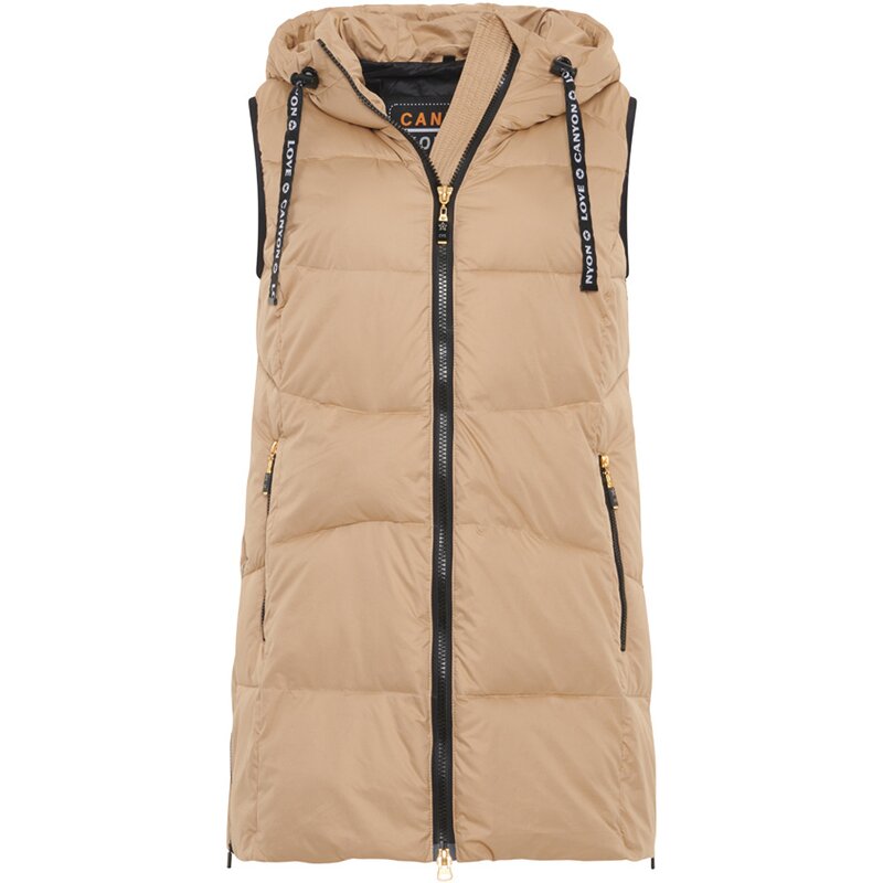 Современный утеплённый длинный жилет CANYON с широкой горизонтальной стёжкой и слегка свободным кроем. Он имеет воротник-стойку, капюшон, регулируемый шнурком, двустороннюю молнию и два боковых кармана на молнии. Подкладка жилета контрастного цвета.