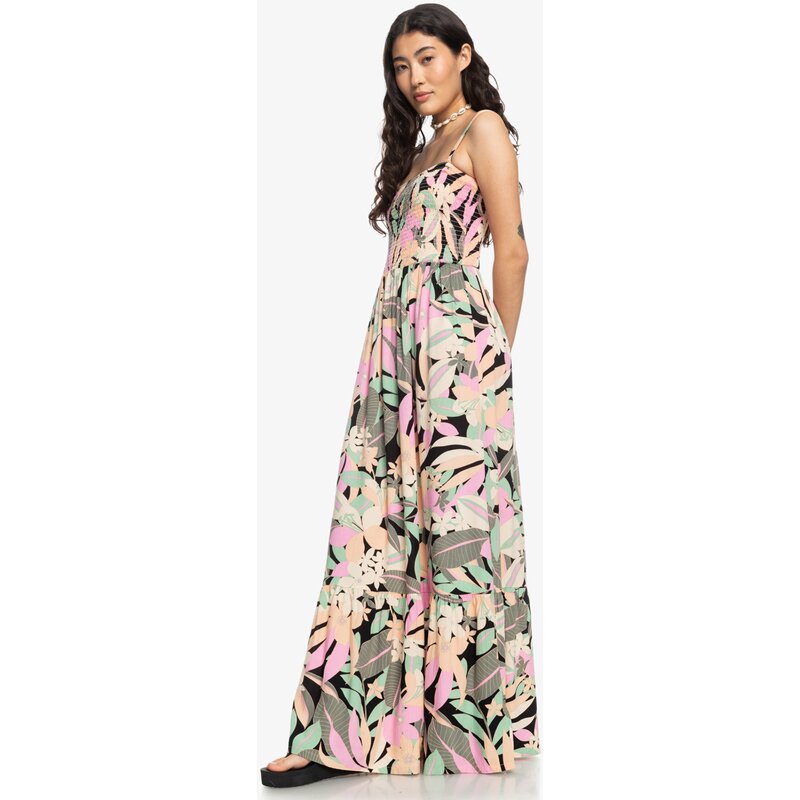 Платье макси для женщин. Характеристики изделия: ткань Ecovera (вискозный креп) средней плотности с принтом [158 г/м²], прямой вырез горловины, регулируемые и съёмные бретели, другие особенности: присборенный эластичный лиф, крупные оборки по низу. Внешний вид изделия может незначительно отличаться в зависимости от расположения принта.