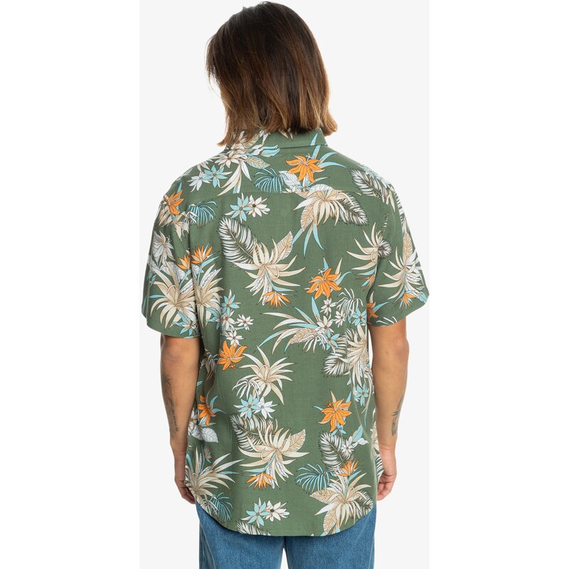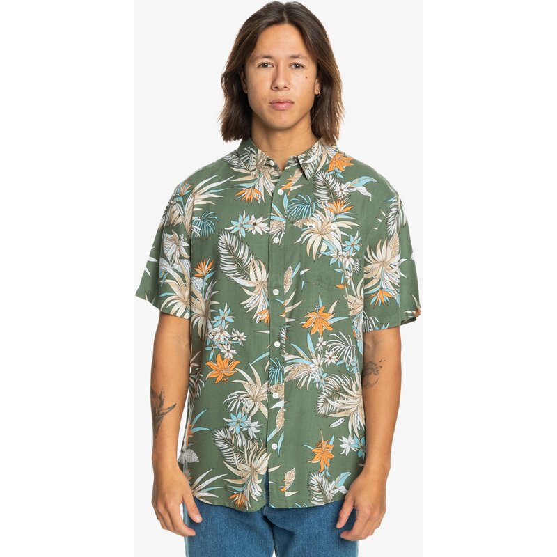 Мужская рубашка с короткими рукавами. Характеристики: мягкая и свободная вискозная ткань, классический крой, воротник/вырез: отложной воротник, стандартная застёжка на пуговицы, нагрудный карман, логотип: переработанная тканая этикетка Quiksilver с логотипом на нагрудном кармане.