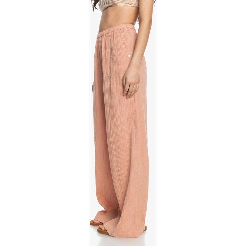 Женские брюки с эластичным поясом. Особенности: марлевая ткань средней плотности двойного плетения из органического хлопка [118 г/м²], широкие штанины, свободный крой, эластичный пояс, фиксированная застежка и накладные карманы спереди.