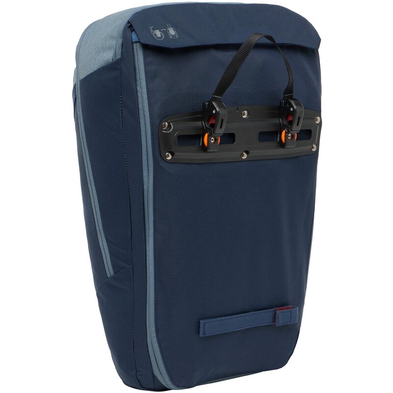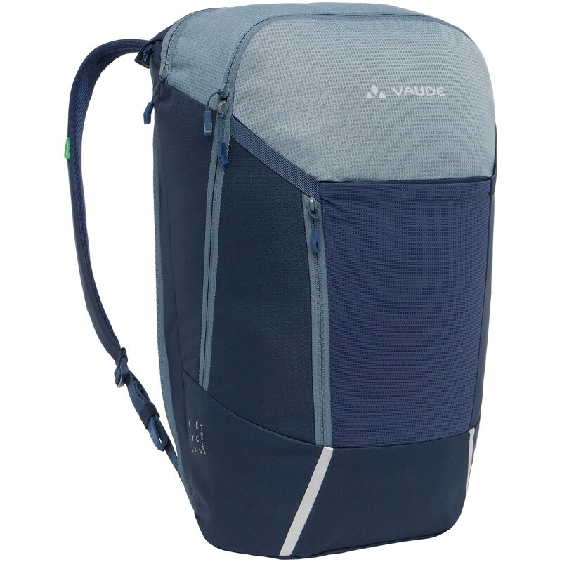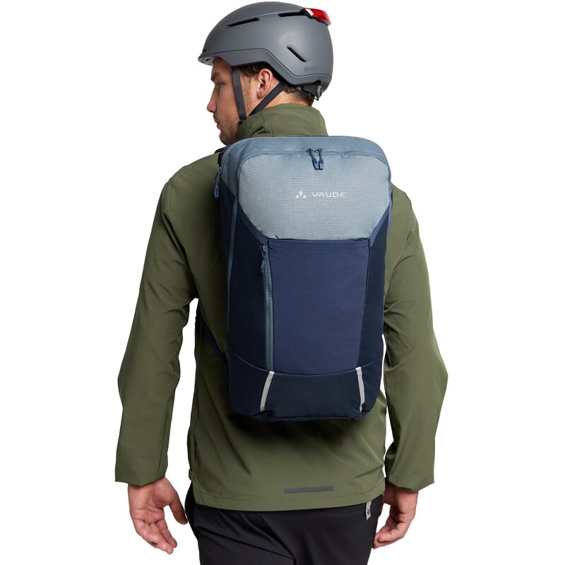 Рюкзак или сумка для велосипеда? И то, и другое! Cycle 20 — идеальный спутник для тех, кто путешествует на работу и обратно, кому нужно, чтобы сумка надежно крепилась на велосипеде во время езды, а в поезде, автобусе или университете можно носить ее как рюкзак. Сумка крепится к багажнику с помощью запирающихся крючков QMR (например, с замком TSA, не входит в комплект) и может быть легко преобразована в рюкзак. Для этого расстегните две вертикальные молнии, и вся система крепления убирается в отделение, закрывающееся на липучку. Функция преобразования объясняется всего несколькими шагами на пришитой, легко снимаемой этикетке. Но эта умная комбинация рюкзака и сумки для велосипеда предлагает еще больше. В большом основном отделении, где есть место для документов формата А4, сетчатый органайзер на молнии для мелких предметов помогает поддерживать порядок. Отдельное отделение с мягкой подкладкой на молнии вмещает ноутбуки размером до 15,6". Спереди расположен плоский сетчатый карман для быстрого хранения журналов или мокрой одежды. Держатель для шлема и светоотражающие элементы, гармонично вписанные в дизайн, дополняют комфортные функции. Основной материал Cycle на 50% состоит из переработанного полиэстера, а контрастный материал – даже на 100%. Наш быстросменный художник обработан водоотталкивающей пропиткой EcoFinish без PFC. Маркировка VAUDE Green Shape означает экологически чистый, функциональный продукт, изготовленный из устойчивых материалов.
