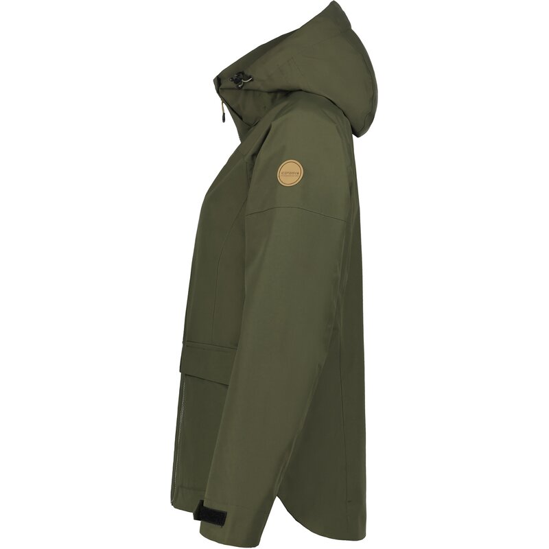 Женская куртка Icepeak. Свободный крой. Удлинённый крой. Регулируемый съёмный капюшон. Регулируемые манжеты. Два передних кармана на молнии. Внутренний карман. Регулируемый подол. Водонепроницаемость 10 000 мм. Воздухопроницаемость 5000 г/м²/24 ч. При разработке этой куртки AWS ACTIVE особое внимание было уделено функциональности и комфорту, что делает её подходящей как для интенсивных, так и для спокойных занятий. Содержит переработанный материал. Все швы проварены, что делает изделие полностью водонепроницаемым. Изготовлена из двухслойного материала, сочетающего водонепроницаемую мембрану и функциональную ткань. Поверхность ткани обработана водоотталкивающим средством.