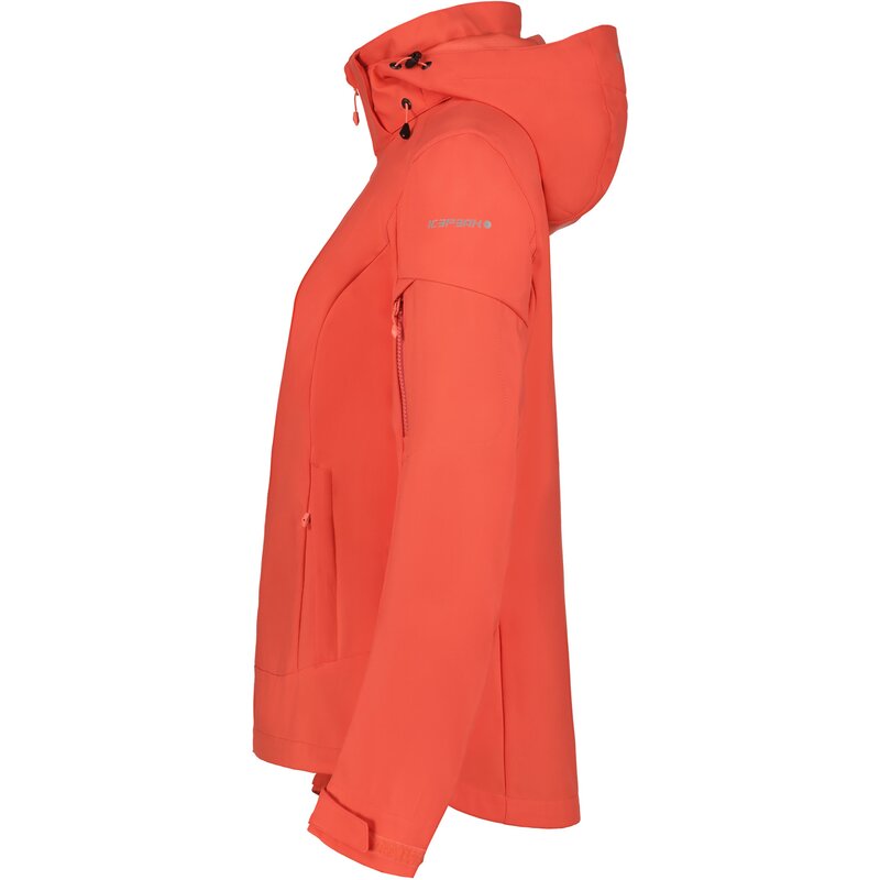 Куртка Icepeak softshell для женщин. Классический крой. Удобный внутренний воротник. Регулируемый и съемный капюшон. Манжеты регулируются липучкой. Два передних кармана на молнии. Карман на рукаве на молнии. Ветрозащитная планка. Молния с защитой подбородка. Регулируемый подол. Формованный подол. Водонепроницаемость 10 000 мм. Воздухопроницаемость 5 000 г/м²/224 ч. Softshell — функциональный материал для самых разных видов активного отдыха на свежем воздухе. Изделие обеспечивает защиту от непогоды, оставаясь при этом приятно эластичным. Пропитка без PFC. Этот продукт AWS EXTREME отвечает потребностям любителей активного отдыха на свежем воздухе, даже в экстремальных условиях. Структурные детали и защитные материалы делают изделие функциональным в любой ситуации, независимо от погоды. Поверхность ткани имеет водоотталкивающую отделку. Без подкладки.