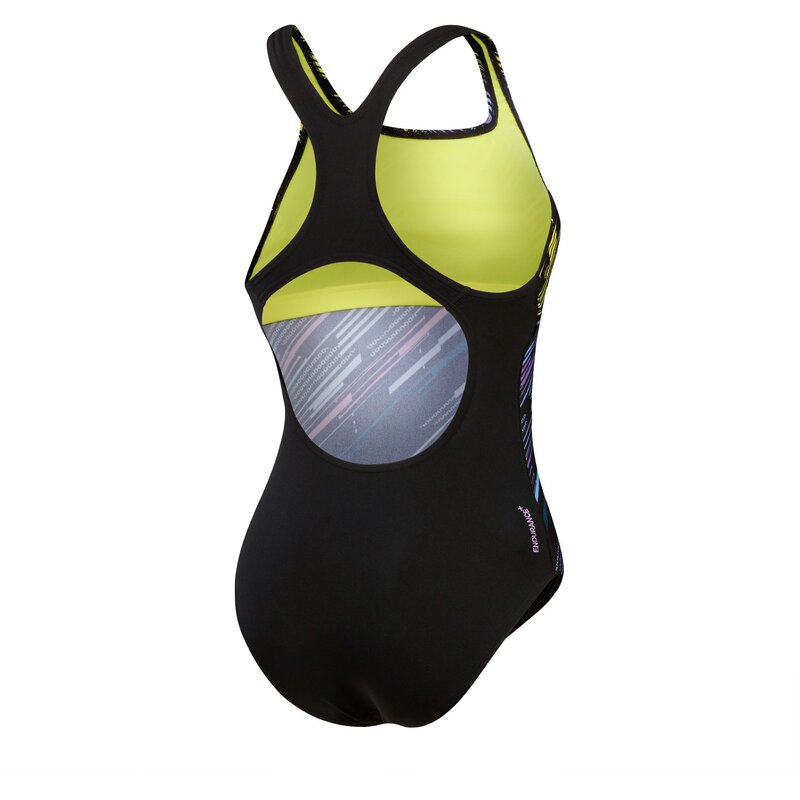Эстетика, вдохновлённая технологиями. Проведите плавание в нашем эффектном чёрном купальнике Medalist с яркой неоновой графикой, символизирующей скорость и импульс. Наша популярная модель Speedo имеет среднюю посадку и небольшой вырез на спине для максимального комфорта во время тренировок. Улучшенный дизайн обеспечивает улучшенную поддержку груди, удобную эластичную резинку под грудью и подкладку из ПБТ для минимизации движений груди. Этот прочный купальник из нашей новой быстросохнущей ткани Endurance+ MAX, на 100% устойчивой к хлору, прослужит долго. Кроме того, полиэстер и пряжа PBT в ткани Endurance+ MAX изготовлены из 100% переработанных отходов потребления, таких как переработанные пластиковые бутылки.