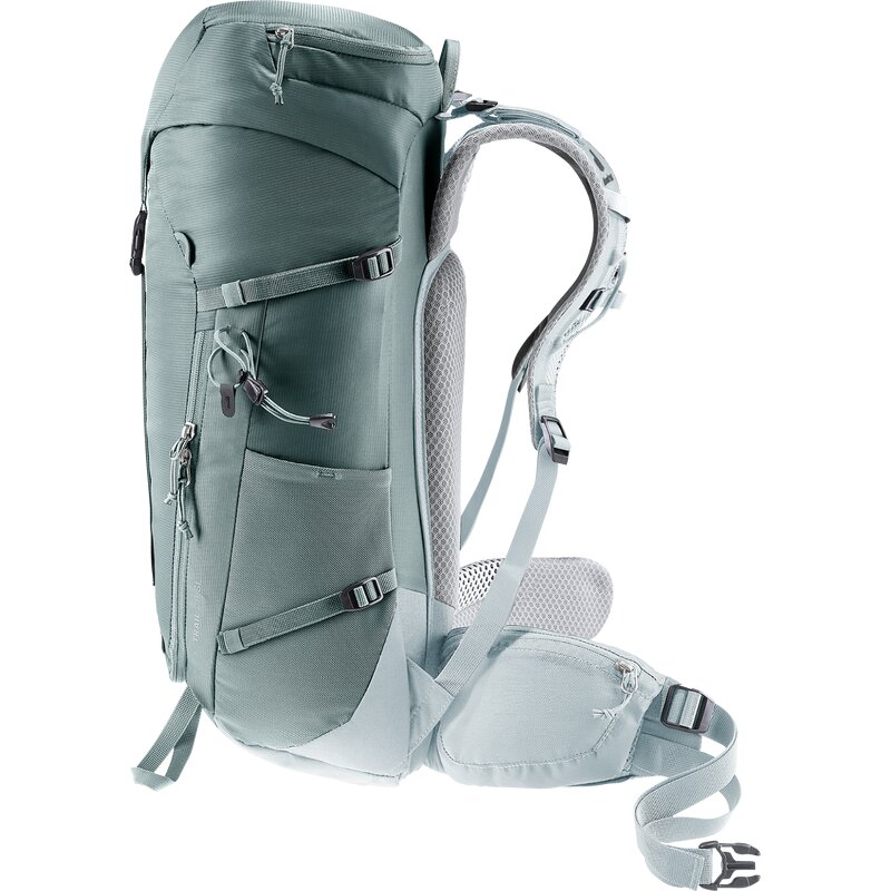 Система поддержки спины Airstripes с низкой поддержкой спины и широкими вентиляционными каналами, а также перфорированные плечевые ремни и набедренные накладки с карманами обеспечивают оптимальную циркуляцию воздуха, равномерное распределение веса и, следовательно, компактную посадку на любой местности. Плоская конструкция крышки обеспечивает достаточное пространство над головой – даже со шлемом. Благодаря креплениям на плечевых ремнях карабины комплекта via ferrata всегда под рукой. Кроме того, снаряжение и материалы всегда будут под рукой благодаря большому переднему доступу на молнии и боковым карманам.