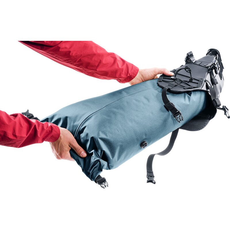 Лёгкая двухсекционная сумка на руль для настоящих путешественников, состоящая из лёгкого водонепроницаемого рюкзака с закручивающимся верхом с обеих сторон и компрессионным клапаном, а также рюкзака из прочного материала с эластичным компрессионным шнуром и петлями для снаряжения сверху. Она позволяет быстро загружать и выгружать вещи во время внезапных остановок, так как держатели рюкзака можно оставить на велосипеде, а рюкзак взять с собой. Прочные ремни регулируются под широкий диапазон диаметров труб благодаря застежке-липучке для защиты от скручивания и входящим в комплект проставкам, а также подходят для карбоновых велосипедов.