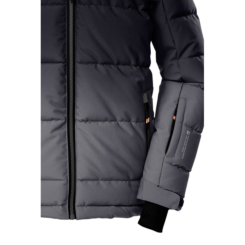 С этой толстой утеплённой зимней курткой Killtec, выполненной из пуха и имеющей модный градиентный дизайн, ваши зимние развлечения не знают границ. Куртка водоотталкивающая, ветронепроницаемая и дышащая (водоотталкивающие свойства 10 000 мм, 3000 г/м²/24 ч). Капюшон с козырьком регулируется. Сетчатая вставка с терморегуляцией обеспечивает комфортный микроклимат. Лайкровые манжеты на регулируемых манжетах и нескользящая снегозащитная вставка предотвращают проникновение ветра и влаги. Многочисленные карманы вместят все необходимое, например, телефон, ски-пасс и другие вещи. Подол регулируется шнурком. Куртка также украшена модными светоотражающими элементами. Эта куртка пропитана веществами, не содержащими фтора.