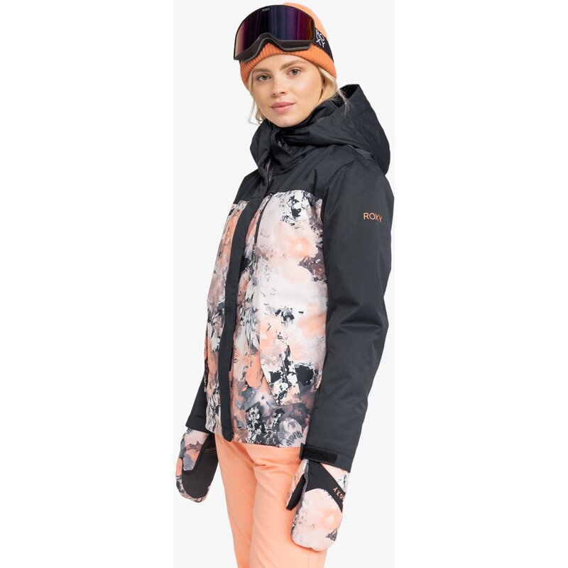 Снежная куртка для женщин. Характеристики данного товара: Покрой: стандартный, Водонепроницаемость: технология 10K ROXY DryFlight [10 000 мм / 5 000 г], Прочная водоотталкивающая обработка без PFC, Проклеенные швы, Материал: полотняное переплетение из 54,8% переработанного полиэстера и 45,2% полиэстера (набивные панели), кареточный переплетение из 100% полиэстера (сплошные панели), Утеплитель: ROXY WarmFlight, 70% переработанного материала [Наполнитель: торс 120 г, рукава 100 г, капюшон 60 г], Подкладка: легкая тафта из 60% переработанного полиэстера и трикотажа с начесом, Другие характеристики: регулируемый в 3 направлениях съемный капюшон, фиксированная юбка из тафты с кнопками, система крепления куртки к брюкам, карманы для рук, нагрудный карман, внутренние карманы для медиа-устройств и очков, карман для ски-пасса на рукавах, Сетчатая подкладка для вентиляции подмышек, эластичная защита от снега на внутренней стороне запястья, карабин для ключей.