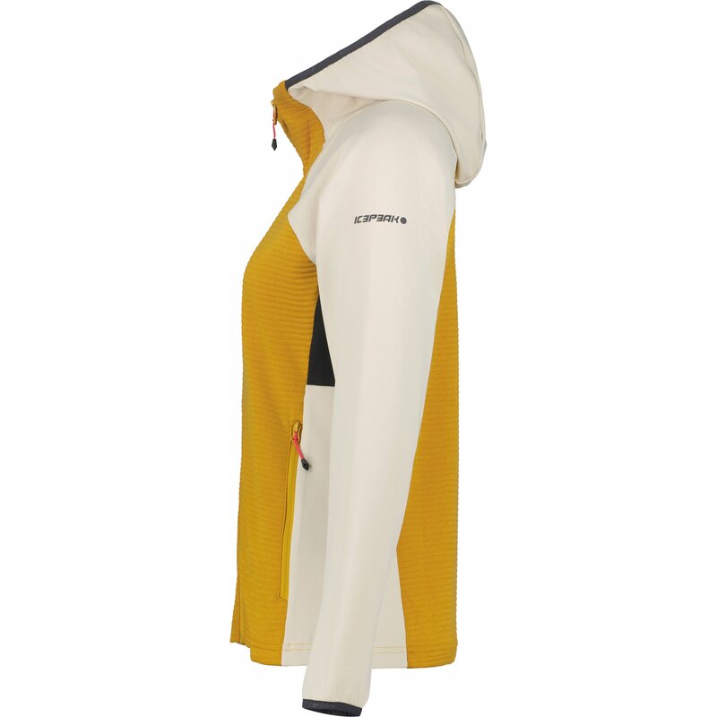 Женская куртка среднего слоя Icepeak. Приталенный крой. Несъемный капюшон. Эластичный капюшон. Эластичные манжеты. Два передних кармана на молнии. Ветрозащитная планка. Термоматериал теплый и легкий, быстро сохнет.