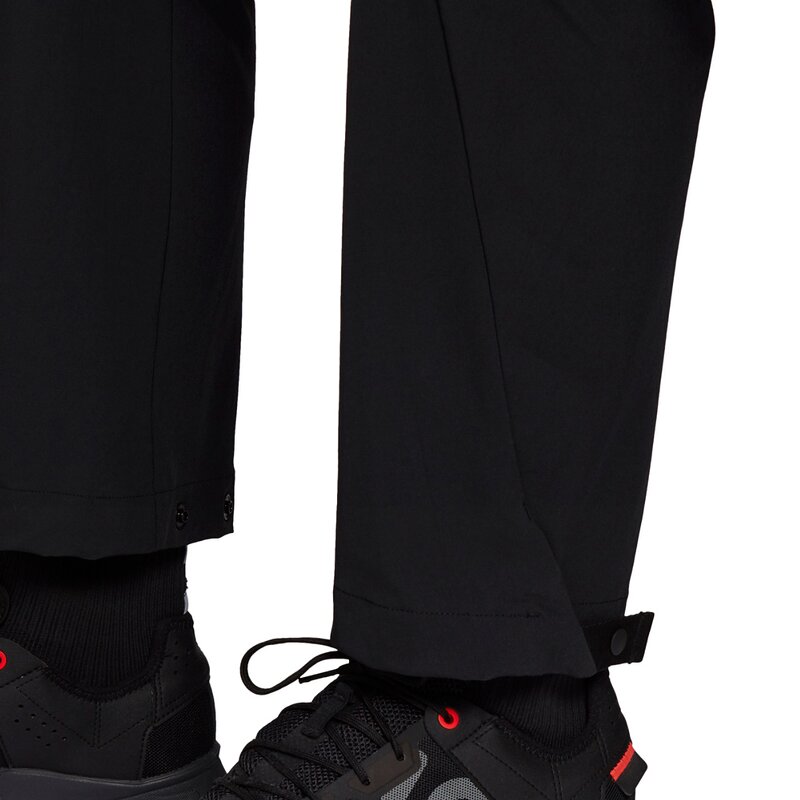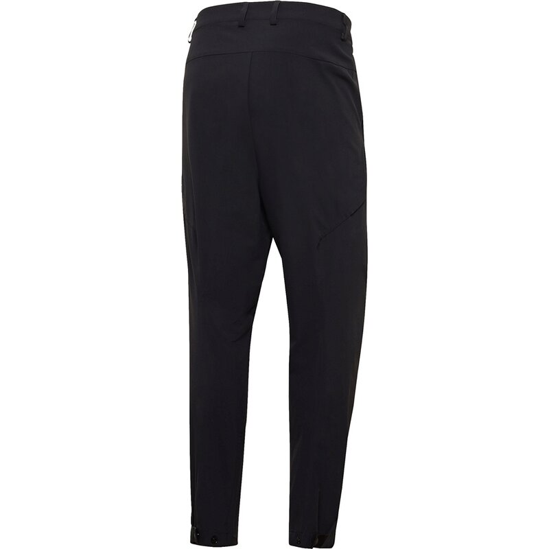 Передние карманы на молнии; потайные карманы сзади; асимметричные шлёвки для ремня; анатомические штанины; регулируемые манжеты