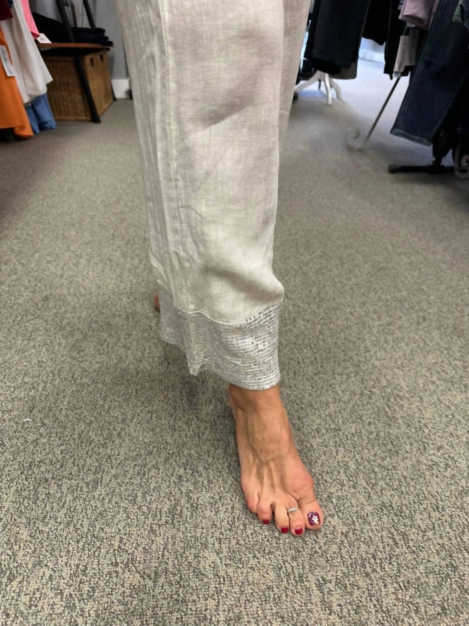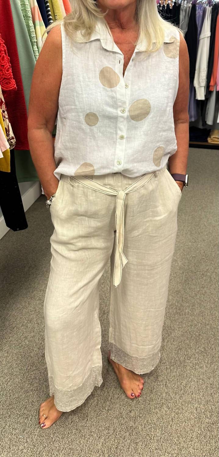 Представляем женские блестящие брюки Eternelle - шикарный выбор для вашего летнего гардероба для путешествий. Эти текстурированные капри песочного цвета из 100% льна обеспечивают дышащую посадку и легкий блеск. Брюки надеваются на застежку, имеют эластичный пояс и завязываются в тон, что добавляет элегантности. Благодаря классическому широкому крою эти капри обеспечат комфорт и стильный вид любому повседневному наряду.