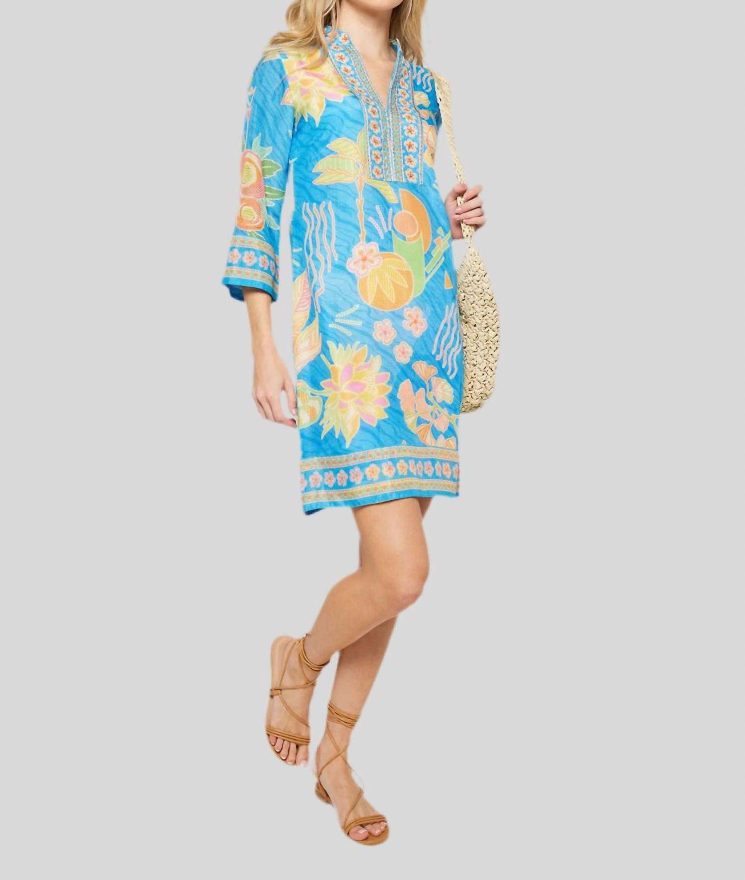 Откройте для себя универсальное очарование этой туники-блузки, которая идеально подходит как для многослойного ношения, так и в качестве самостоятельного образа. Ее изящный силуэт и стильные детали делают ее незаменимой вещью в гардеробе. Платье-туника Bahama от Bella Tu представляет собой яркое сочетание океанского синего, мандаринового, цитрусового и ярко-розового цветов с очаровательным цветочным узором. Платье изготовлено из шелковистой вискозы, имеет вышитый вручную V-образный вырез и воротник-стойку, дополненные рукавами три четверти и ручной вышивкой бисером, идеально подходит для создания повседневного элегантного образа. Это платье-туника длиной 37 дюймов (91 см) на подкладке для комфорта и защиты. Застежка: надевайте. Уход: ручная стирка в холодной воде, сушка на веревке. На модели рост 175 см (175 см), размер XS.