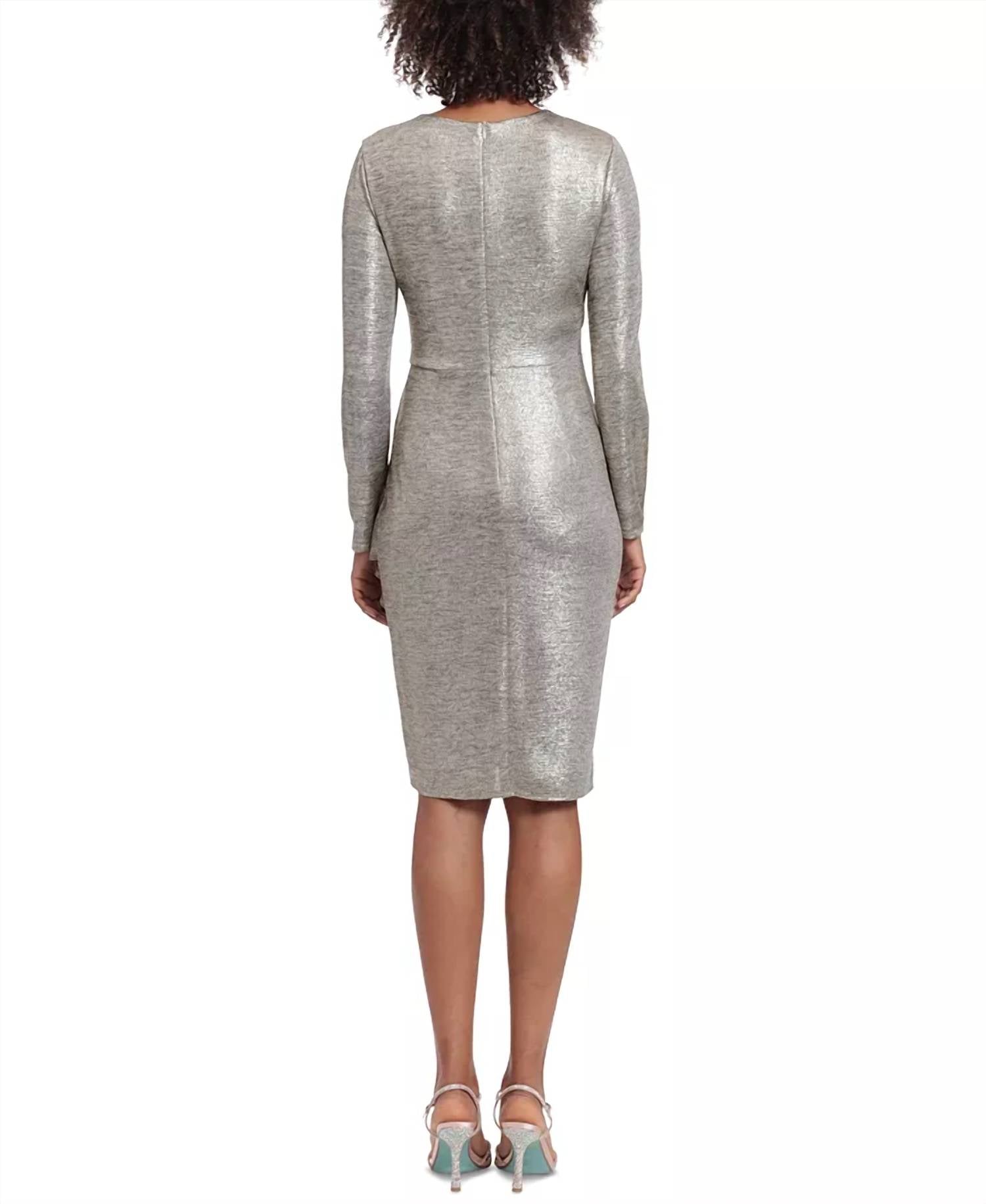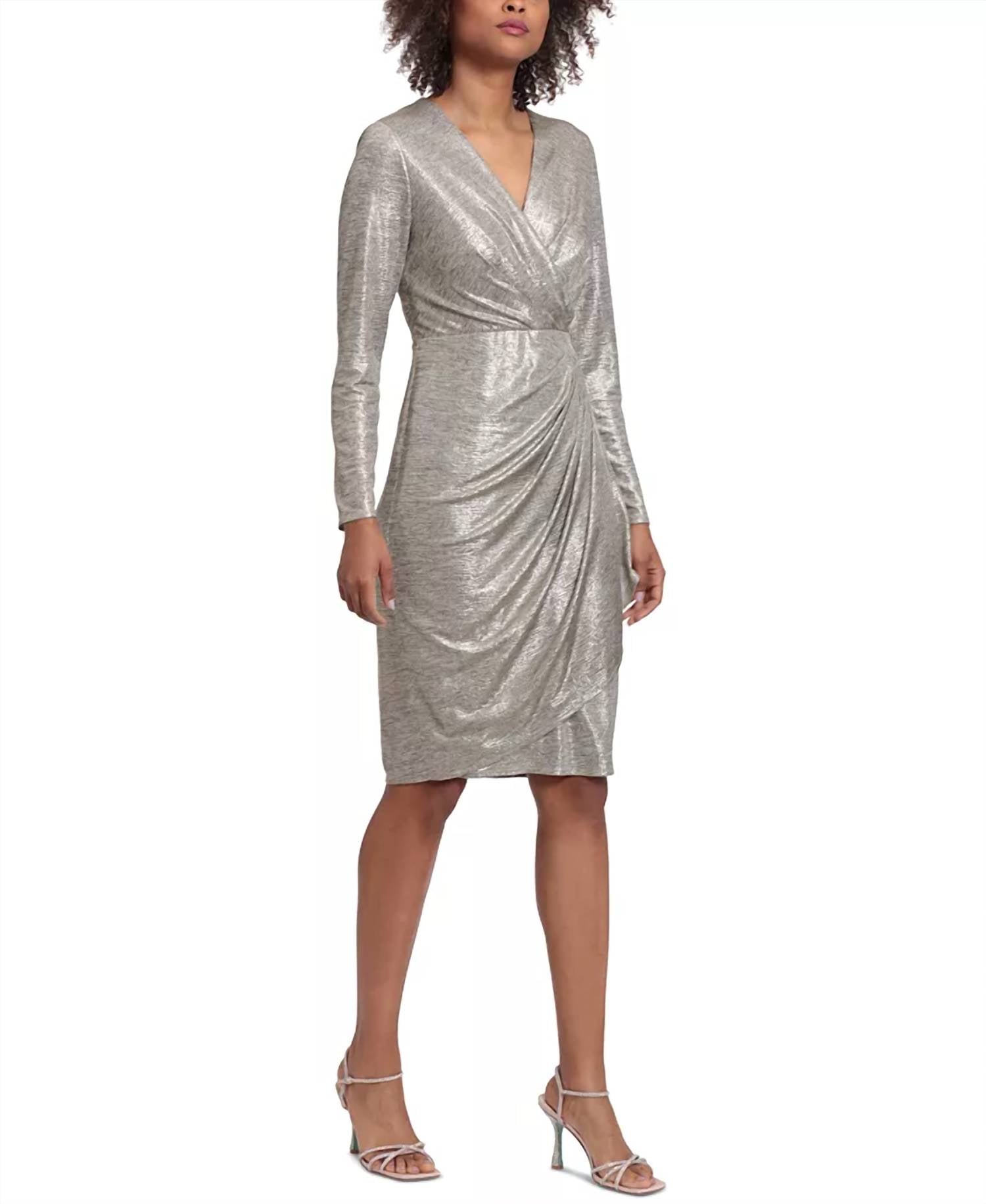 Представляем платье-халат Metallic Wrap Dress от LONDON TIMES - элегантный выбор для вечерних мероприятий или празднования Нового года. Это платье отличается гламурным дизайном с длинными рукавами и V-образным вырезом с эффектом стихарь. Платье изготовлено из 95% полиэстера и 5% спандекса, облегающий силуэт длиной 90 см обеспечивает приталенный крой, подчеркивающий фигуру, а плиссированные детали добавляют изысканности. Застежка: потайная молния. Уход: ручная стирка в холодной воде и сушка на горизонтальной поверхности. Платье идеально подходит для женщин ростом 160 см и ниже, выполнено из текстурированного трикотажа джерси, обеспечивающего мягкость и эластичность. Идеально подходит для воплощения тренда на сдержанную роскошь этого лета.