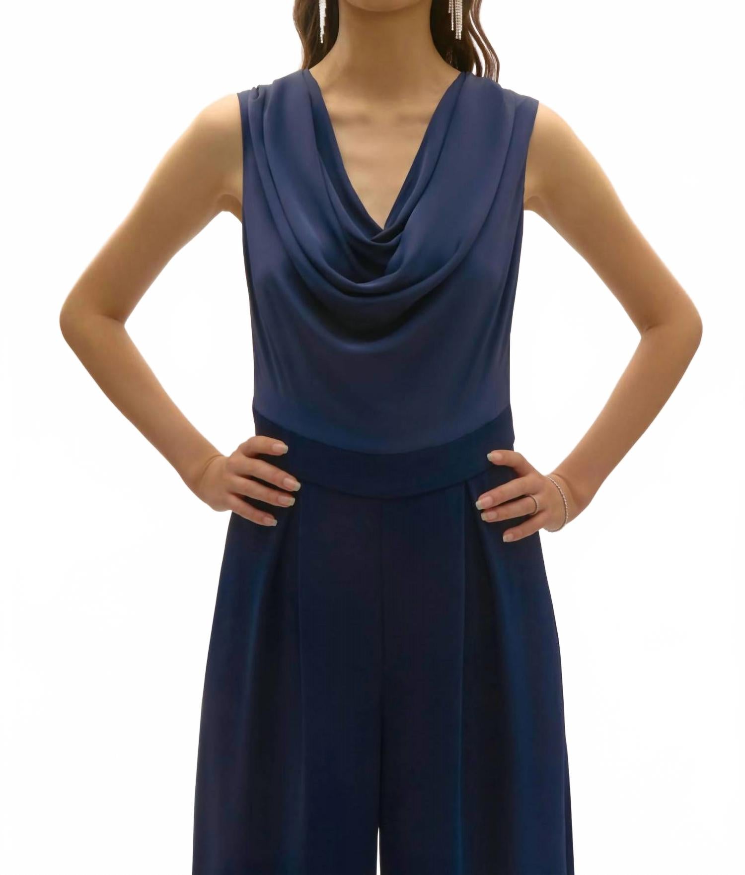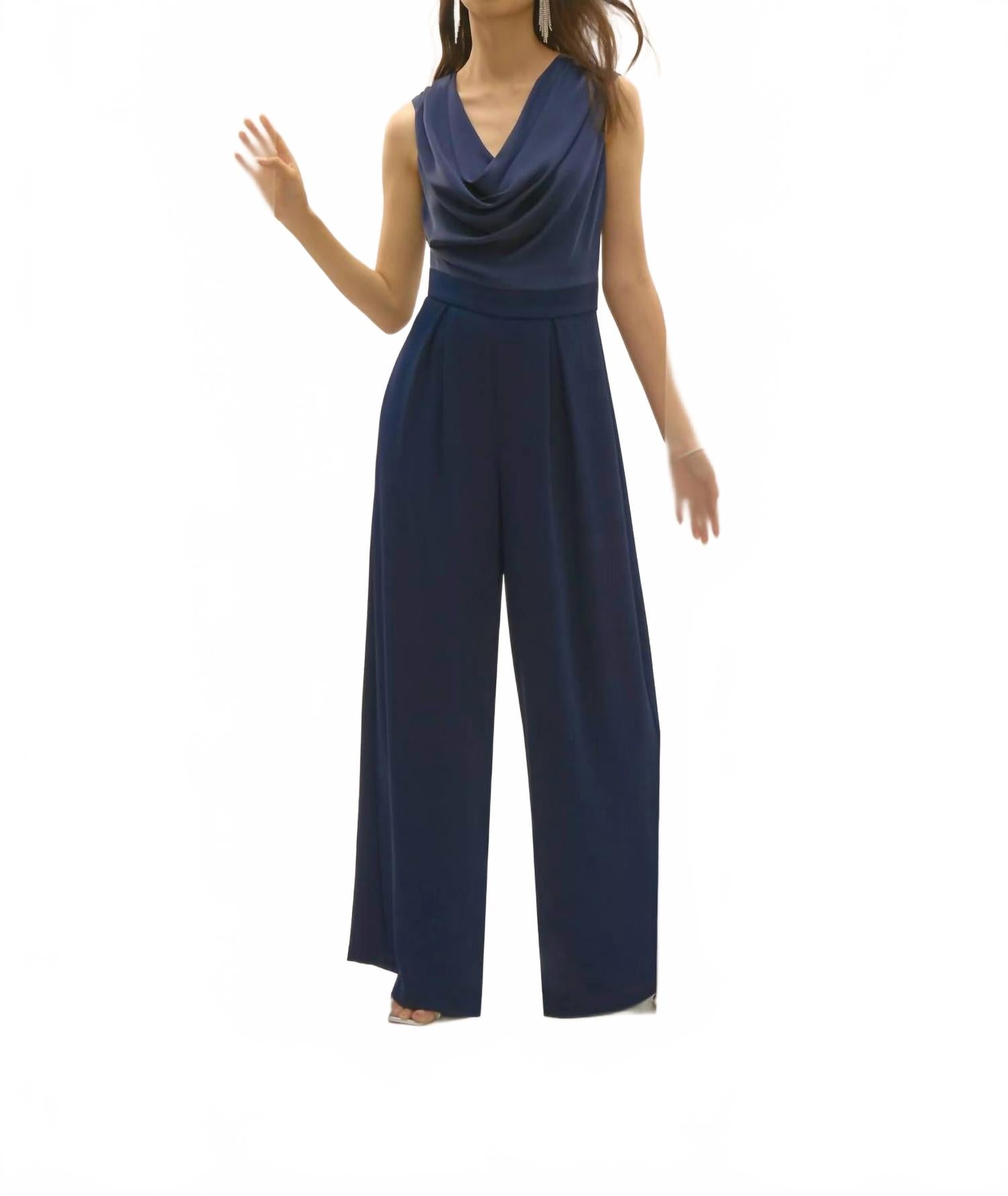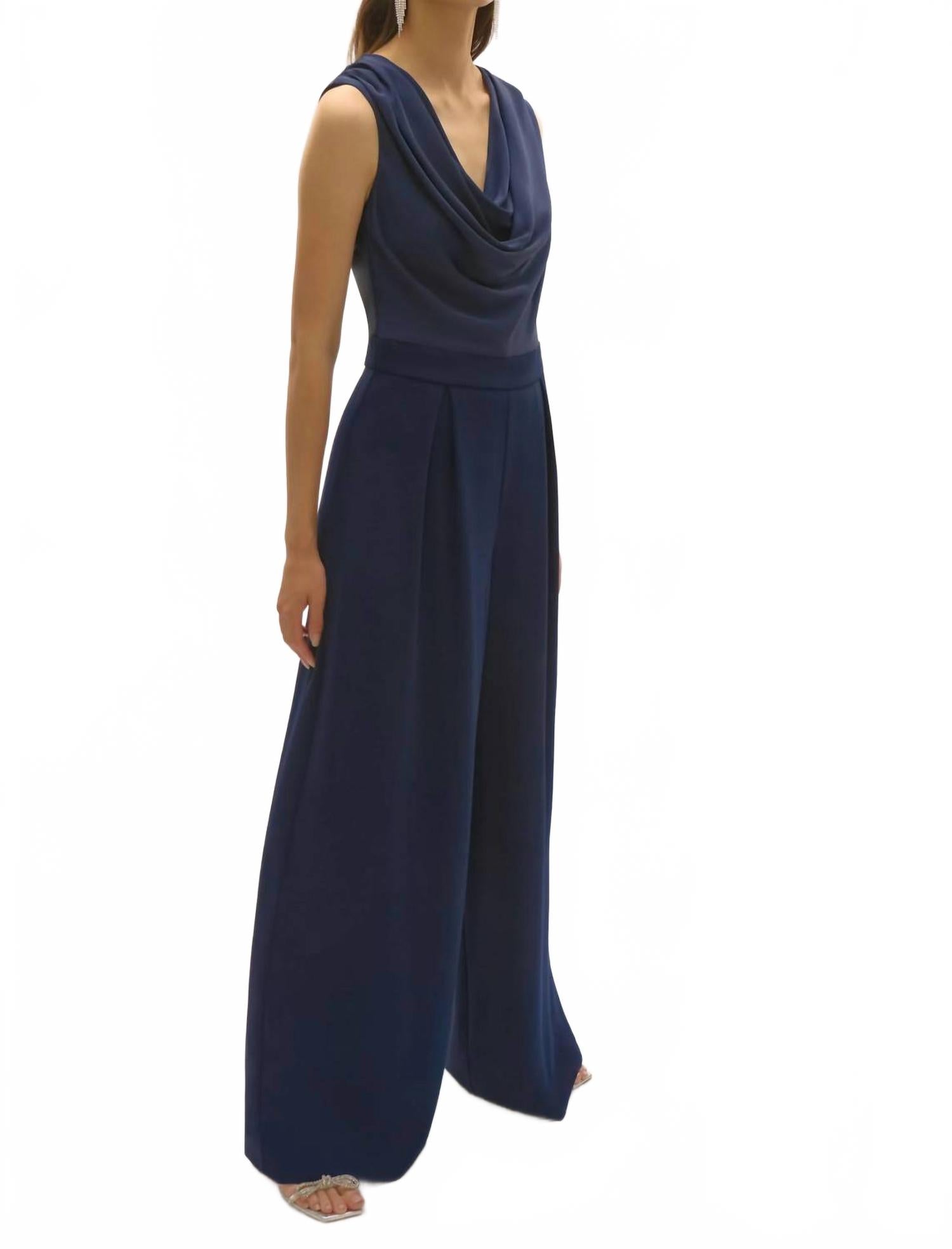 Этот комбинезон выглядит стильно и непринужденно, не прилагая больших усилий. Добавьте несколько ярких украшений для создания более нарядного образа или наденьте кроссовки для более непринужденного образа. Комбинезон Joseph Ribkoff Cowl Neck без рукавов в цвете Midnight Blue - идеальное сочетание элегантности и стиля для любого изысканного случая. Этот шикарный комбинезон полной длины с роскошным верхом из полиэстерового атласа, драпированным вырезом-хомутом и элегантным дизайном без рукавов излучает вневременную привлекательность. Изготовленный в Канаде, комбинезон отличается широким кроем и плиссировкой спереди, что обеспечивает изящную свободу движений, а незаметная молния сзади обеспечивает идеальную посадку. Уход прост: ручная стирка и сушка на веревке, что делает его роскошным и практичным для любого гардероба.