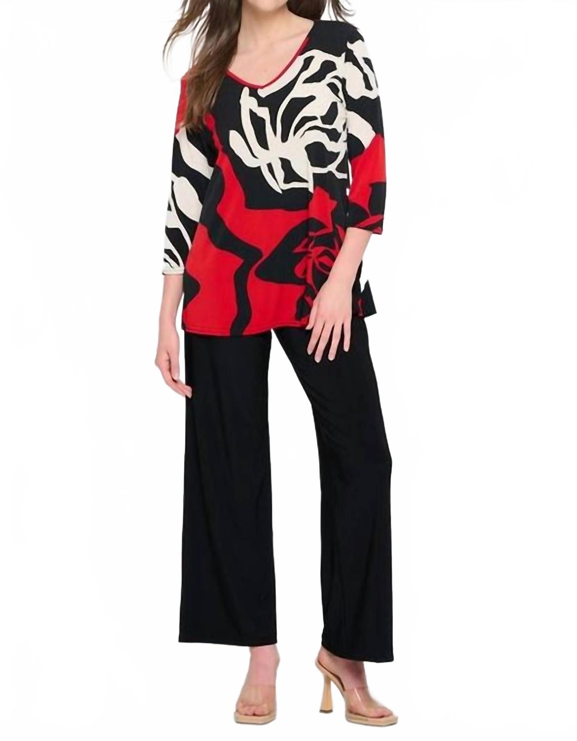 Откройте для себя универсальное очарование этой блузки-туники, которая идеально подходит как для многослойного ношения, так и в качестве самостоятельного образа. Ее изящный силуэт и стильные детали делают ее незаменимой вещью в гардеробе. Откройте для себя вневременную элегантность с женской блузкой-туникой Ruby Ann Voyage от Jostar, которая станет ярким акцентом вашего гардероба. Эта туника с эффектным графическим узором красного и цвета слоновой кости на черном фоне выполнена из 94% полиэстера и 6% спандекса, что обеспечивает отсутствие складок. Благодаря рукавам три четверти и V-образному вырезу, подчеркивающему фигуру, она идеально подходит для создания образа, подходящего для отпуска. Эта блузка, с гордостью произведенная в США, сочетает в себе роскошь и комфорт в вашей летней коллекции.