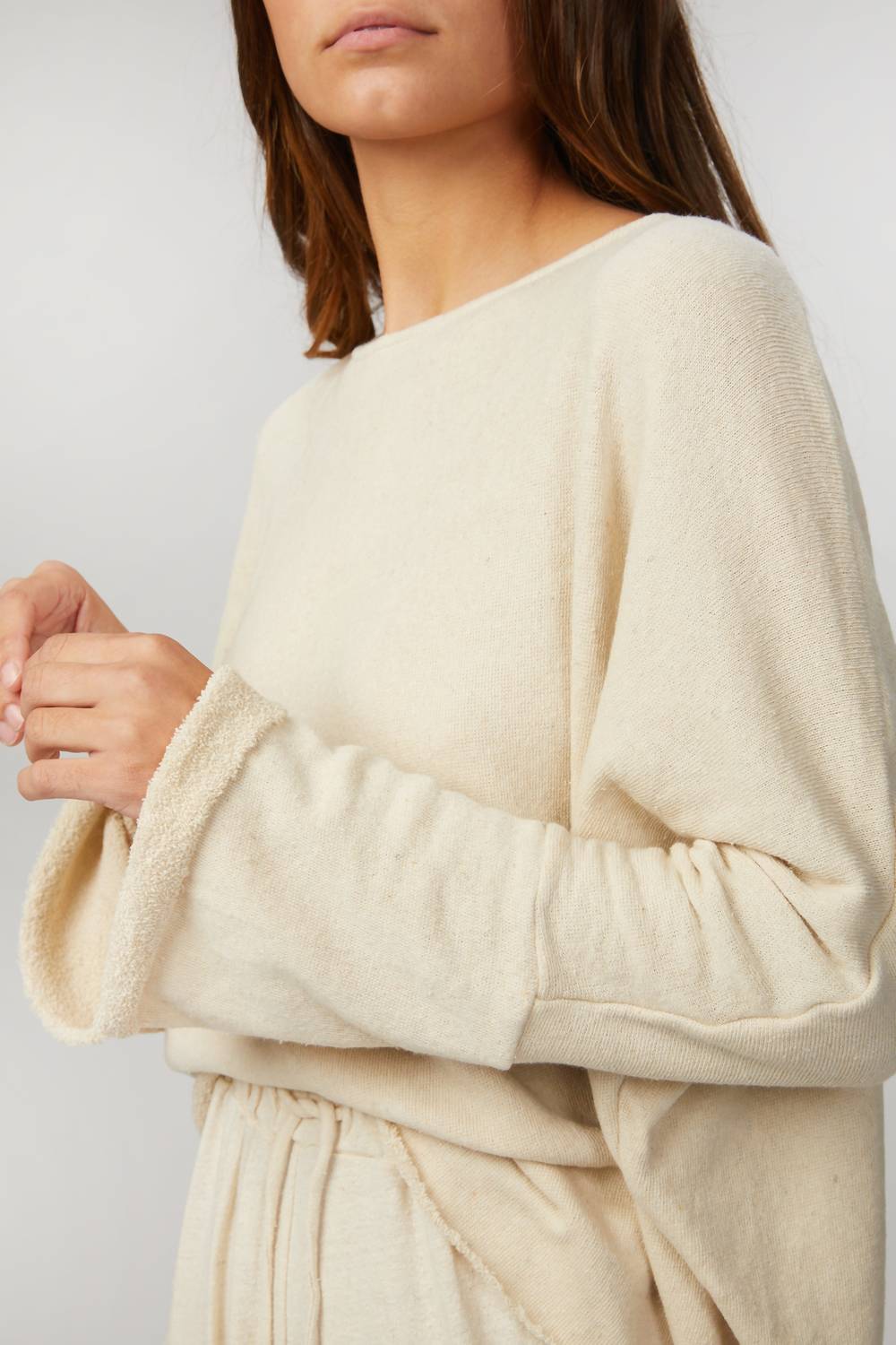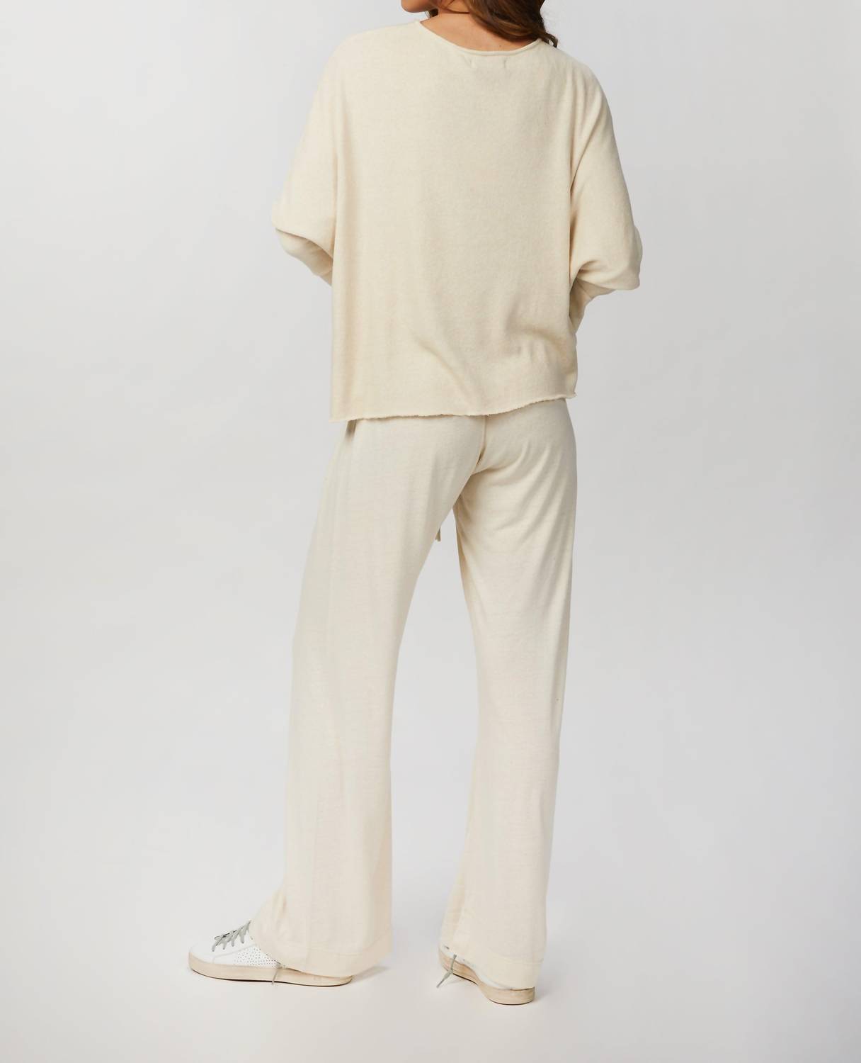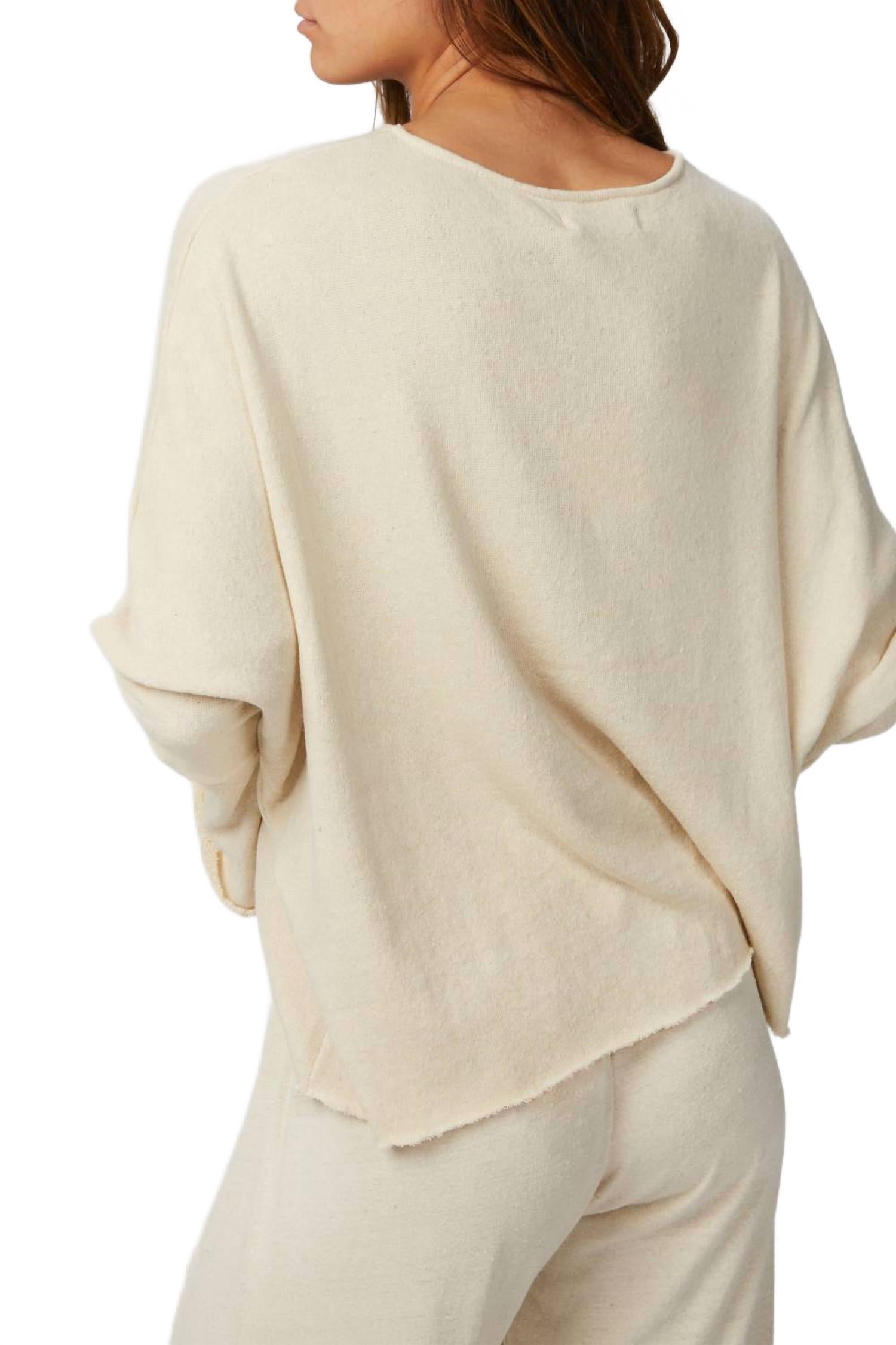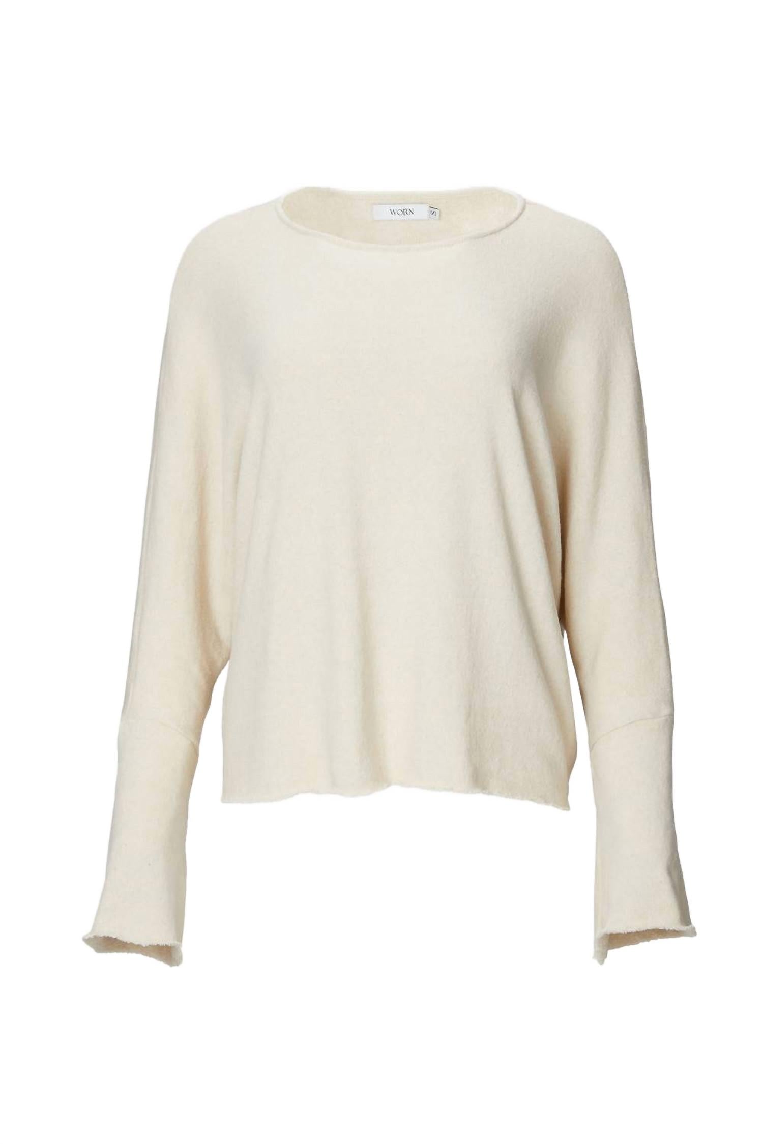 Свитер «Monet» от WORN, выполненный из смеси шерсти и шелка цвета слоновой кости, добавит нотку сдержанной роскоши любому образу. Сшитый вручную в Индонезии, он имеет удобный свободный крой с закругленными плечами и необработанными краями. Дополните его подходящими домашними брюками «Maelle» для гармоничного образа.