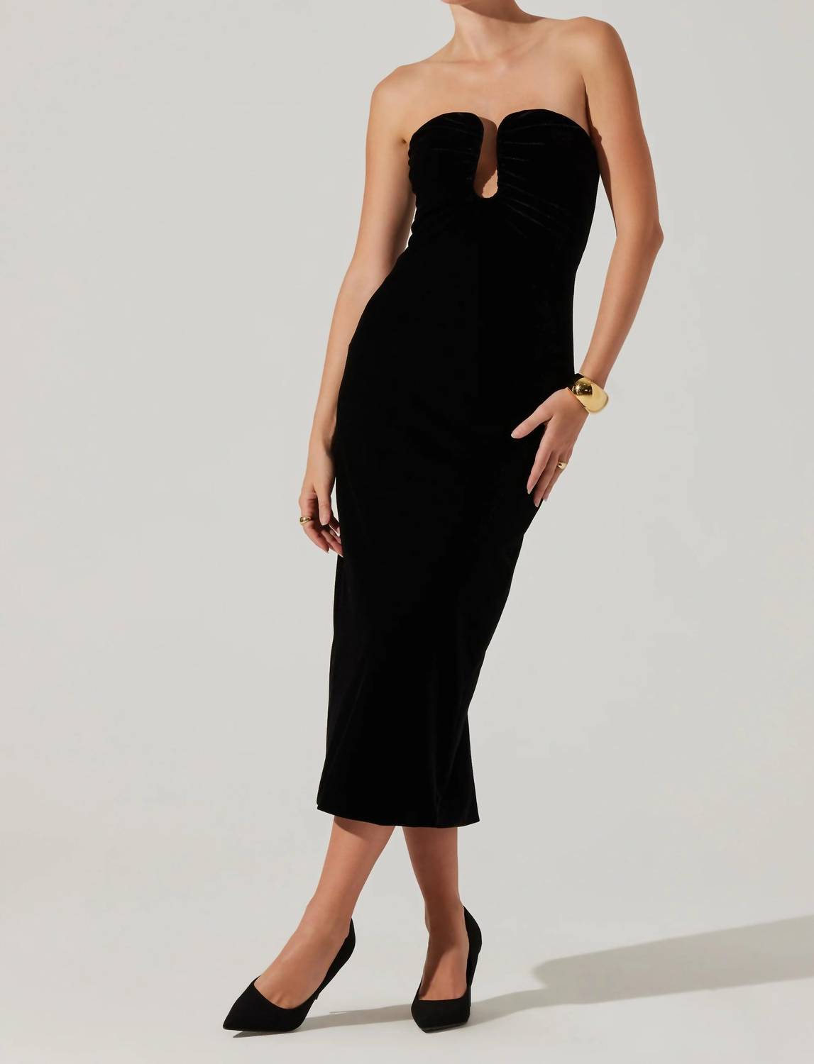 Украсьте свой вечерний образ бархатным платьем-миди Arista Sweetheart от ASTR - шикарным выбором однотонного черного цвета, которое привлечет всеобщее внимание. Вырез сердечком без бретелек, металлическая U-образная поддержка груди и косточки на лифе обеспечивают облегающий силуэт, создавая изысканный образ. Платье изготовлено из 92% полиэстера и 8% эластана, с удобным вшитым бюстгальтером на крючках и подкладкой, что обеспечивает одновременно и модный, и функциональный вид. Рекомендации по уходу: ручная стирка в холодной воде, сушка на веревке и глажка при низкой температуре при необходимости; не отбеливать и не сушить в стиральной машине. Доступно в размере S: длина 50 1/2 дюйма, обхват груди 30 дюймов, обхват талии 28 дюймов.