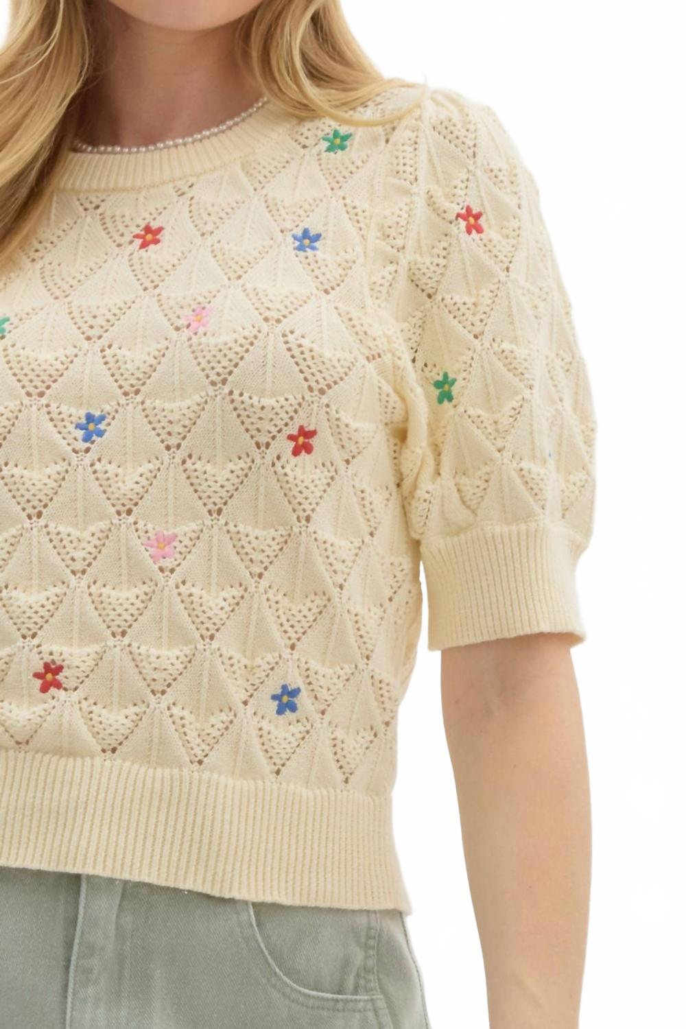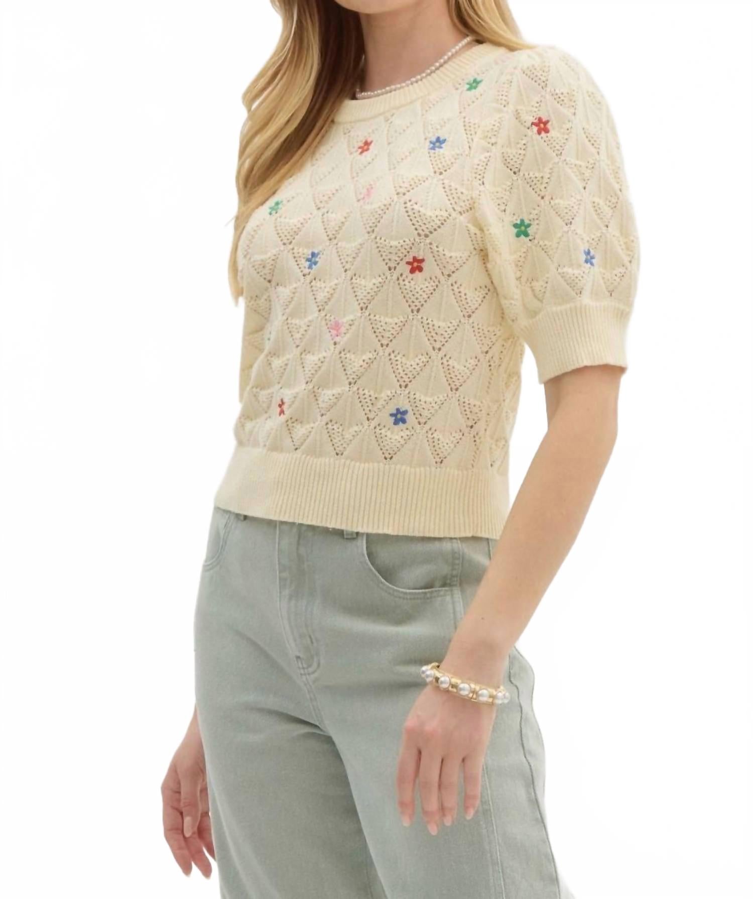 Свитер с ромбовидным узором «Пуантель» от Entro - элегантный бежевый пуловер, идеально подходящий для осени. Этот свитер с короткими рукавами-фонариками и цветочной вышивкой сочетает в себе текстурированную полупрозрачную вязку и 100% хлопок для легкости. Модель имеет круглый вырез и удобную застежку. Уход: машинная стирка и сушка на горизонтальной поверхности. Доступны следующие размеры: обхват груди: маленький (36 дюймов), средний (38 дюймов), большой (40 дюймов), длина: маленький (20 дюймов), средний (20,5 дюймов), большой (21 дюйм).