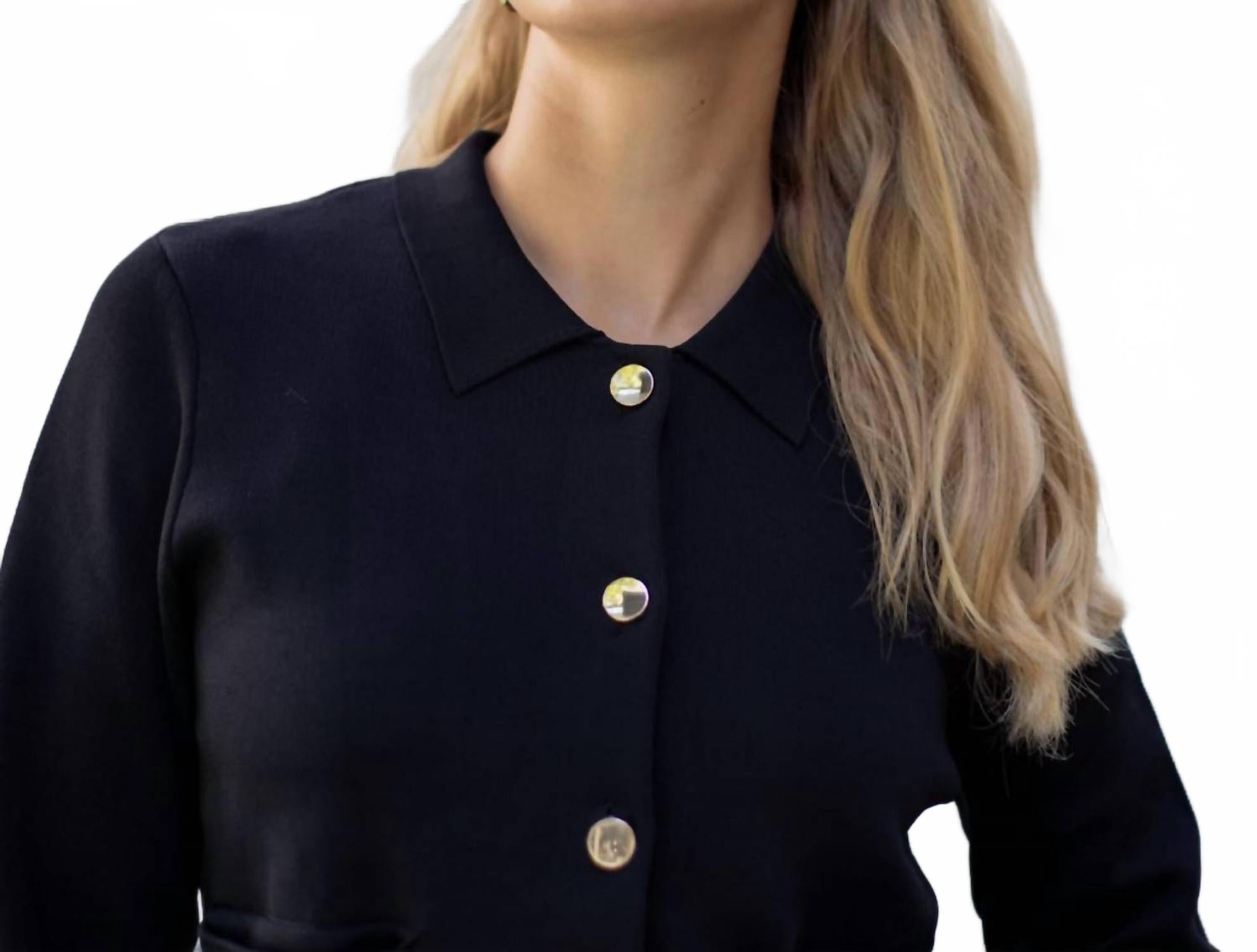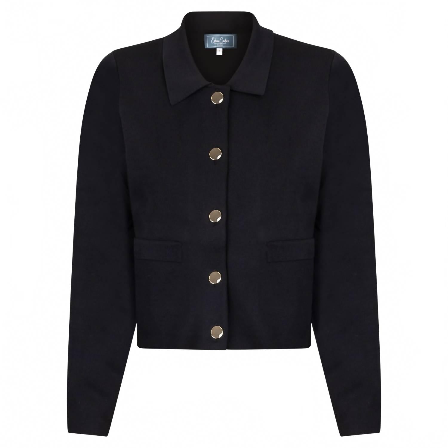 Самая стильная и универсальная куртка в стиле кэжуал. Сочетайте ее с любимыми джинсами или накиньте поверх любого повседневного платья. Представляем трикотажную куртку Aurora от Esteem Couture - изысканное дополнение к вашему гардеробу в классическом черном цвете. Эта куртка из высококачественного трикотажа имеет длинные рукава и укороченную длину с роскошными застежками на золотистых пуговицах. Созданная для современных женщин, она отличается однотонным узором и воротником-стойкой, что делает ее универсальным предметом гардероба, идеально подходящим как для работы, так и для шикарных званых ужинов. Эта куртка идеально подходит для осени, сочетая в себе стиль и практичность благодаря практичным карманам, что делает ее незаменимой вещью в гардеробе каждой женщины.